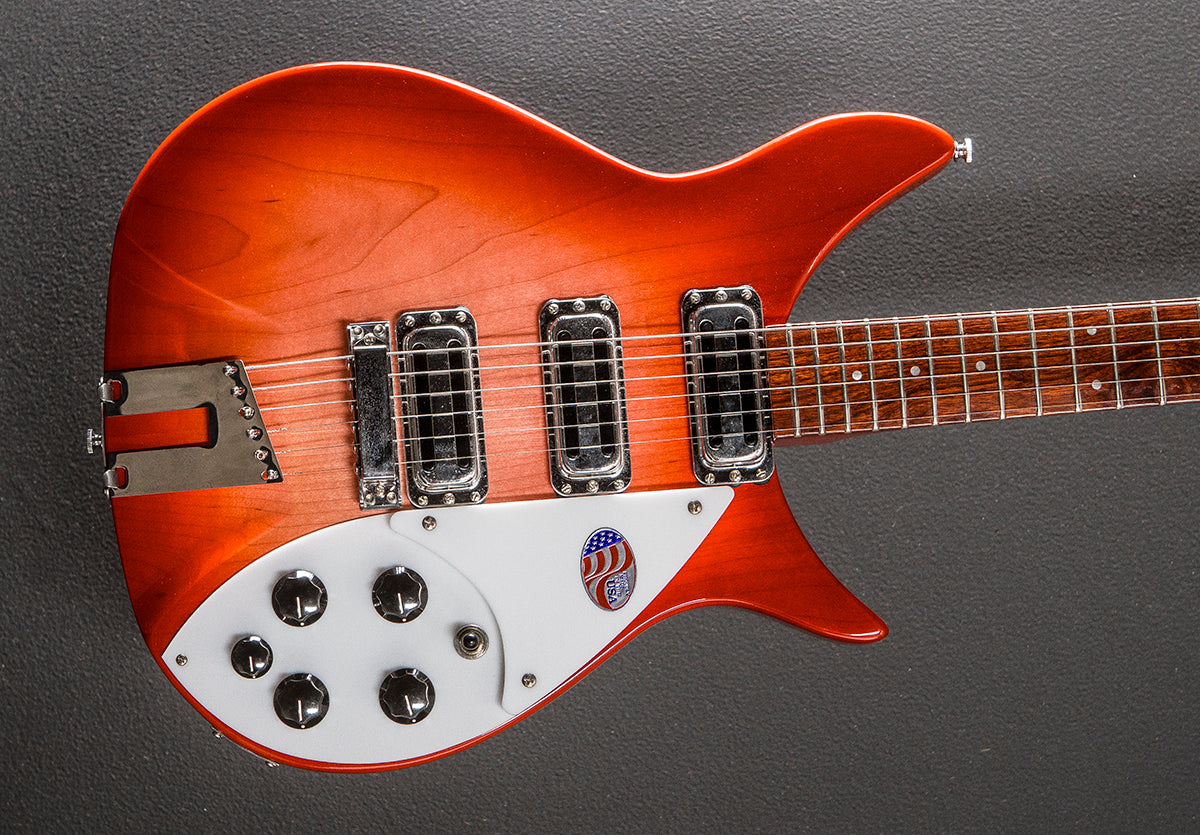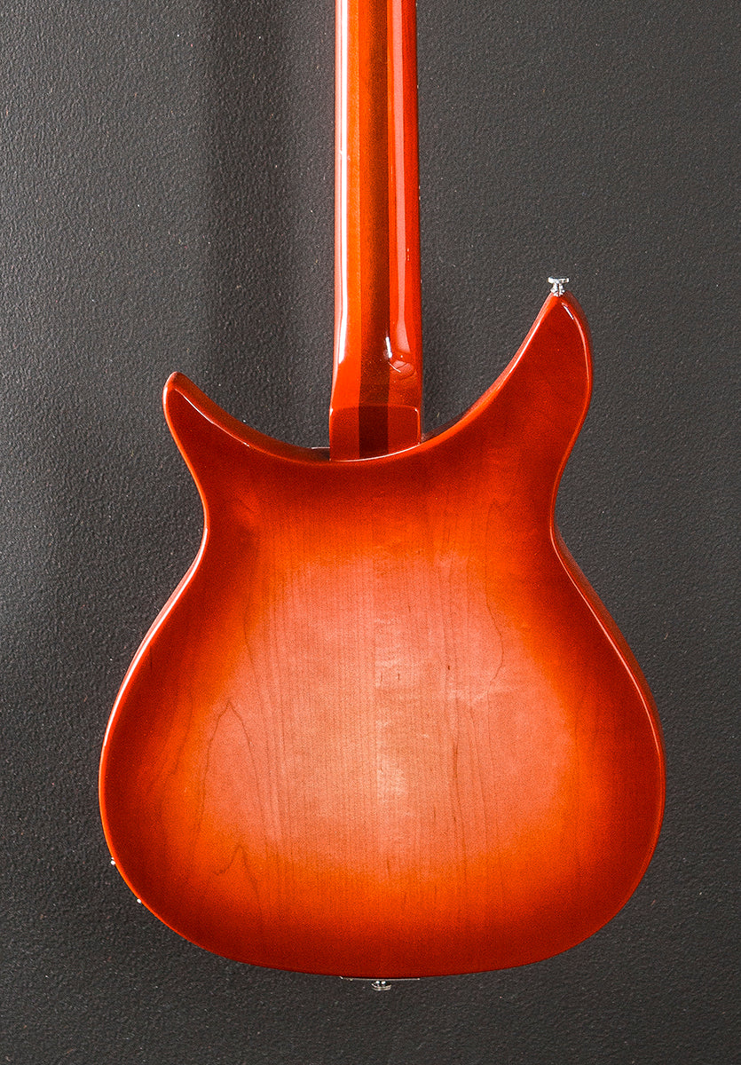 Fireglo, 12.75″ wide semi-hollow Maple body, Set-in Maple/Walnut neck, 10" radius Rosewood fingerboard with the dot inlays, 24.75″ scale length, 1.63″ nut width, Rickenbacker vintage single coil Toaster Top pickups, 3-way toggle switching with the two volume and two tone controls plus the bass blend control, Standard mono output jack, Six saddle adjustable bridge and trapeze tailpiece, Ric deluxe tuners, 6.6 pounds, With the silver tolex hardshell case