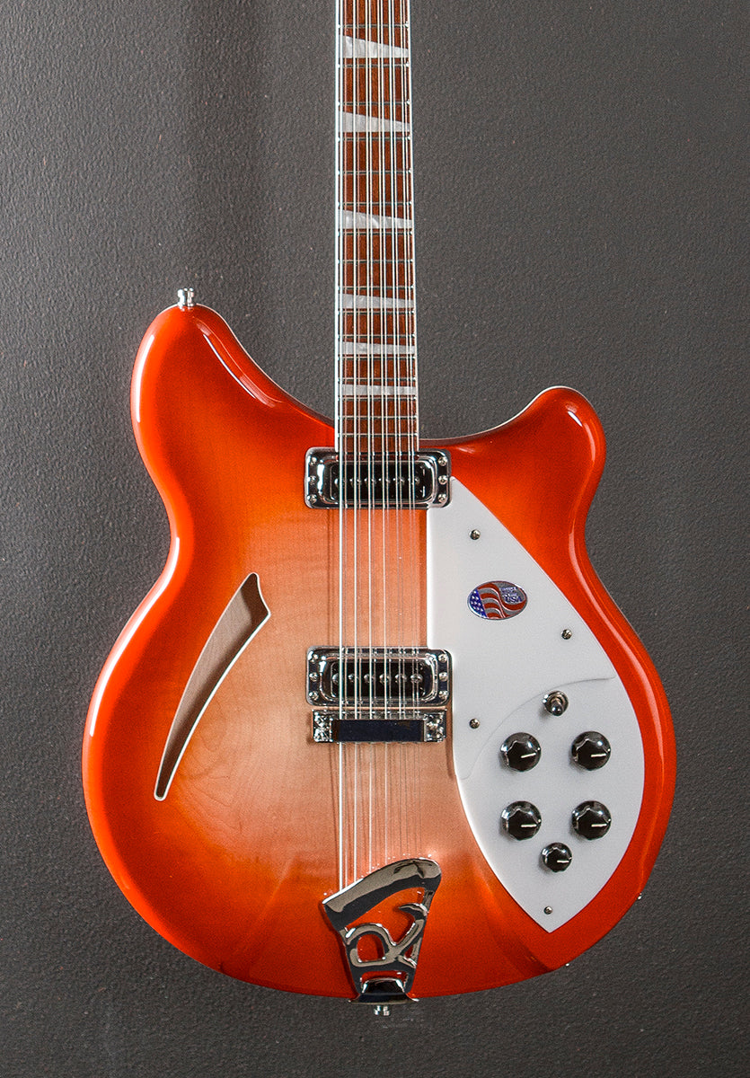 Fireglo, 15″ wide semi-hollow Maple body, Set-in Maple/Walnut neck, Bound 10" radius Rosewood fingerboard with the triangle inlays, 24.75″ scale length, 1.63″ nut width, Rickenbacker Hi-Gain bridge and neck pickups, 3-way toggle switching with the volume and tone controls for each pickup plus the bass blend control, Rick-o-Sound and standard mono output jacks, Six saddle adjustable bridge and "R" tailpiece, Gotoh tuners, 7.8 pounds, With hardshell case