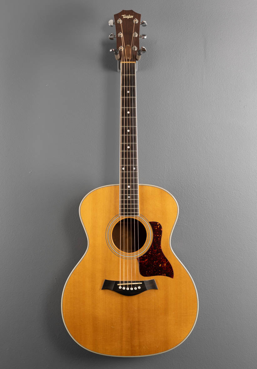 Good Condition, Natural, Solid Spruce top with Sapele back and sides, bound 15" radius Ebony fingerboard with dot inlays on a Mahogany neck, 1 3/4" nut width, 25.5" scale length, the neck measures .80" at the 1st and .83" at the 9th frets, Grover tuners, comes with Taylor hardshell case.