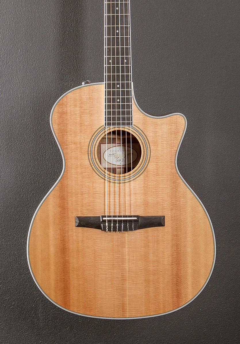 Natural, Gloss top and body finish, Grand Auditorium body shape with the venetian cutaway, Sitka Spruce top, Three Ring Plastic Rosette, Nylon series bracing, Ovangkol back and sides, White binding, Bound Ebony fingerboard with the dot inlays inlays on a Tropical Mahogany neck, 25.5” scale length, 1 7/8th” nut width, Strip tuners, The neck thickness is .84″ at the first and .88″ at the 9th frets, With the ES-N system and Taylor hardshell case, Excellent