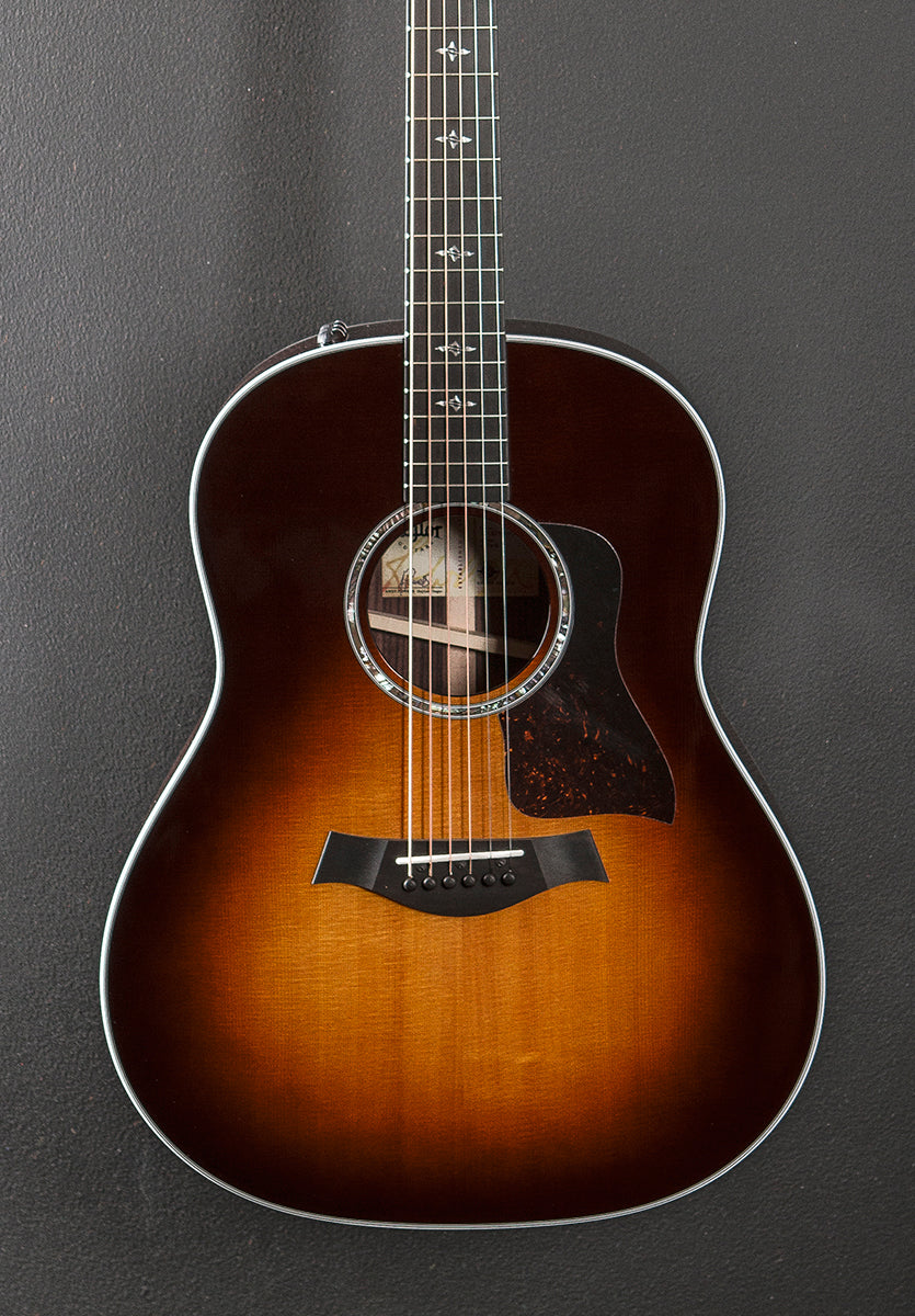 Tobacco Sunburst, Gloss top and body finish, Grand Pacific Dreadnought body shape, Sitka Spruce top, Single Ring Agoya Shell Rosette, V-Class bracing with Relief Rout, Indian Rosewood back and sides, White binding, West African Crelicam Ebony fingerboard with the Italian Acrylic Finial inlays on a Neo-Tropical Mahogany neck, 25.5” scale length, 1 3/4” nut width, Cast/sealed tuners, The neck thickness is .83″ at the first and .88″ at the 9th frets, With the Expression 2 pickup system and Taylor hardshell case, Excellent