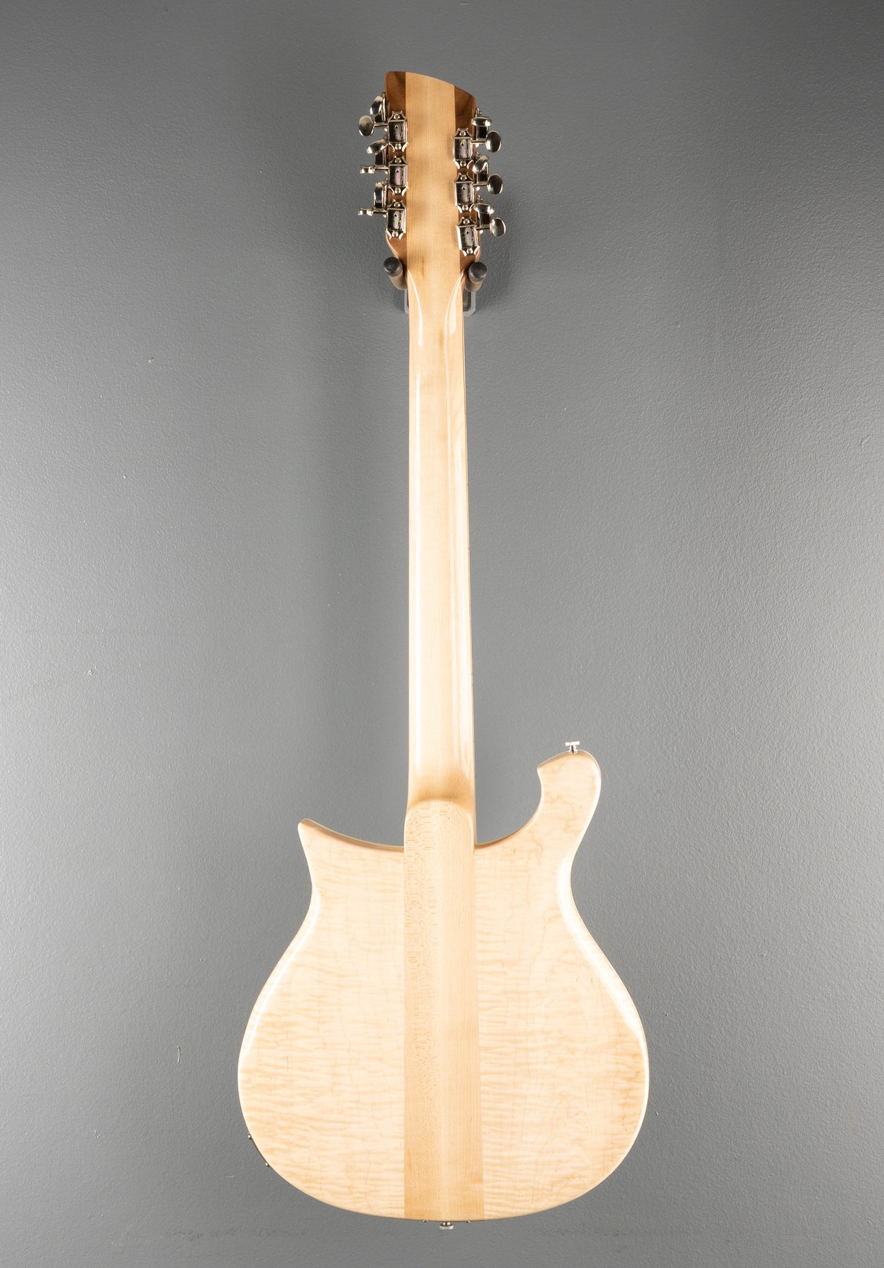Mapleglo, Maple body wings, Thru body Maple neck, Bound 10" radius Rosewood fingerboard with the triangle inlays, 24.75″ scale length, 1.75″ nut width, the neck measures .88" at the 1st and .92" at the 12th frets, Rickenbacker vintage single coil Toaster Top bridge and neck pickups, 3-way toggle switching with the volume and tone controls for each pickup plus the bass blend control, Standard mono output jack, Twelve saddle adjustable bridge and trapeze tailpiece, Ric deluxe tuners, 7.7 pounds, With hardshell case