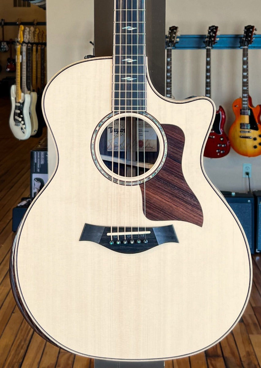 "There's a reason why the 814ce is Taylor's most acclaimed guitar: With its blend of refined craftsmanship, richly textured sound and artful aesthetics, the 814ce represents everything that we stand for as guitar builders. East Indian rosewood back and sides, a Sitka spruce top and V-Class bracing produce a lush response with warm lows, pristine trebles and a slightly scooped midrange, leaving space in the mix for vocals or other instruments. Ideal for flatpicked lead lines, strumming, delicate fingerpicking and everything in between, this Grand Auditorium acoustic-electric boasts a versatile character that translates beautifully in amplified settings through the ES2 pickup. A deluxe hardshell case keeps the 814ce safe wherever you take it."