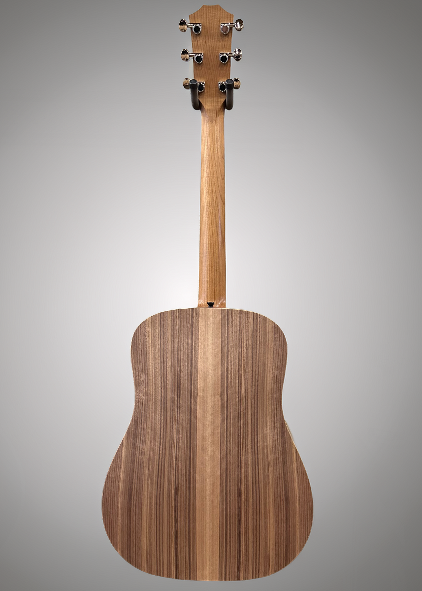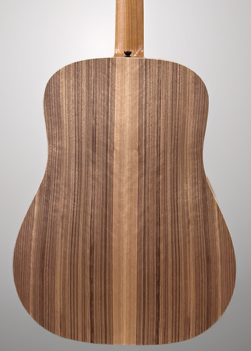 Natural, 15/16th Big Baby Dreadnought body shape, Sitka Spruce top, Single Ring Plastic Rosette, X pattern bracing, Layered Walnut back and sides, Ebony fingerboard with the Italian Acrylic 4mm Dot inlays on a Hard Rock Maple neck, 25.5″ scale length, 1 11/16th” nut width, With gig bag