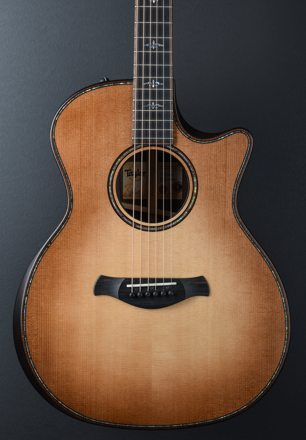 Wild Honey Burst top with the Kona Edgeburst back and sides, Grand Auditorium body shape with the beveled armrest and cutaway, Lutz Spruce top, Single Ring Paua Rosette, V-Class bracing with Relief Rout, Indian Rosewood back and sides, Inset Paua top and back edge trim, West African Crelicam Ebony fingerboard with the Paua/Mother of Pearl Belle Fleur inlays on a Neo-Tropical Mahogany neck, 25.5” scale length, 1 3/4” nut width, Gotoh 510 tuners, With the Expression 2 system and hardshell case