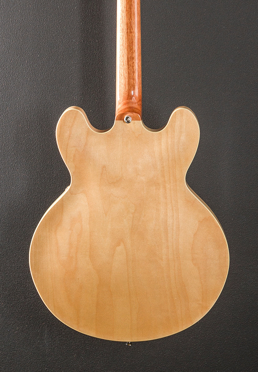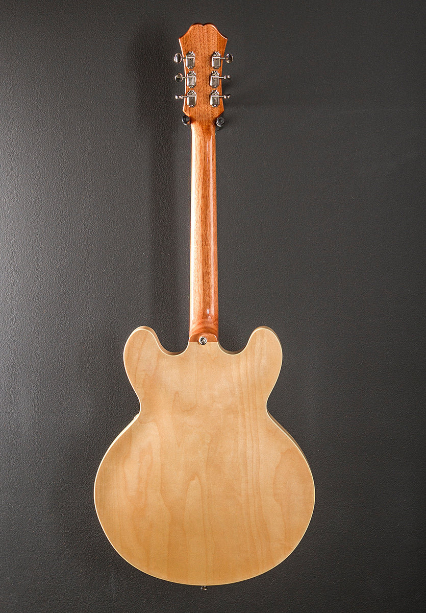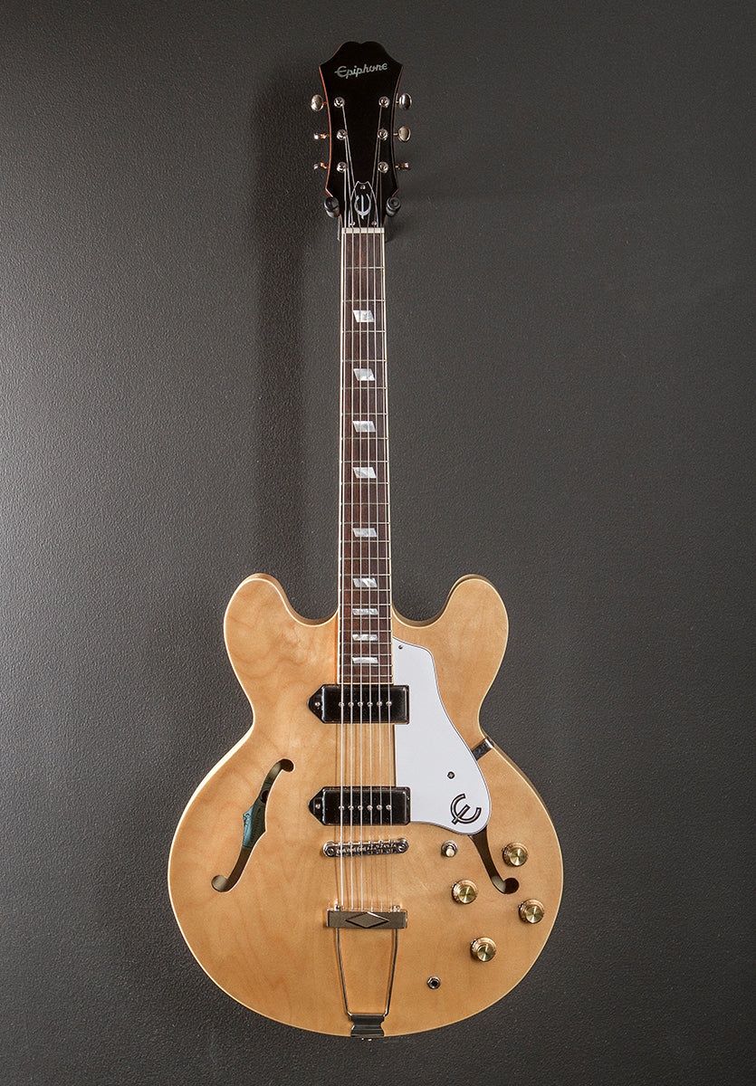 Natural, Gloss finish, Hollow 5-ply layered Maple body, Slim taper 60's C shaped Mahogany neck, Bound 12” radius Indian Laurel fingerboard with the pearloid parallelogram inlays and medium jumbo frets, 24.75" scale length, 1 11/16th" nut width, Epiphone Pro Dogear P-90 bridge and neck pickups, 3-way toggle switching with the volume and tone controls for each pickup, Epiphone LockTone tune-o-matic bridge and trapeze tailpiece, Epiphone vintage deluxe tuners, The neck thickness is .82″ at the first and .93″ at the 12th frets, 6.4 pounds, With gig bag, Very good