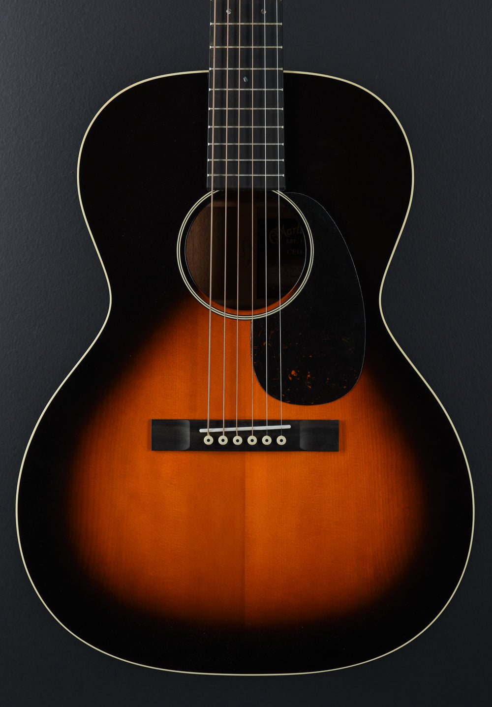 "Reminiscent of models from the “Golden Era”, the CEO-7 features a sunburst finish, golden age tuners and authentic headplate lettering. This new 14-fret short scale 00 “sloped shoulder” model features a solid Adirondack spruce top with solid mahogany back and sides for complex tonality."