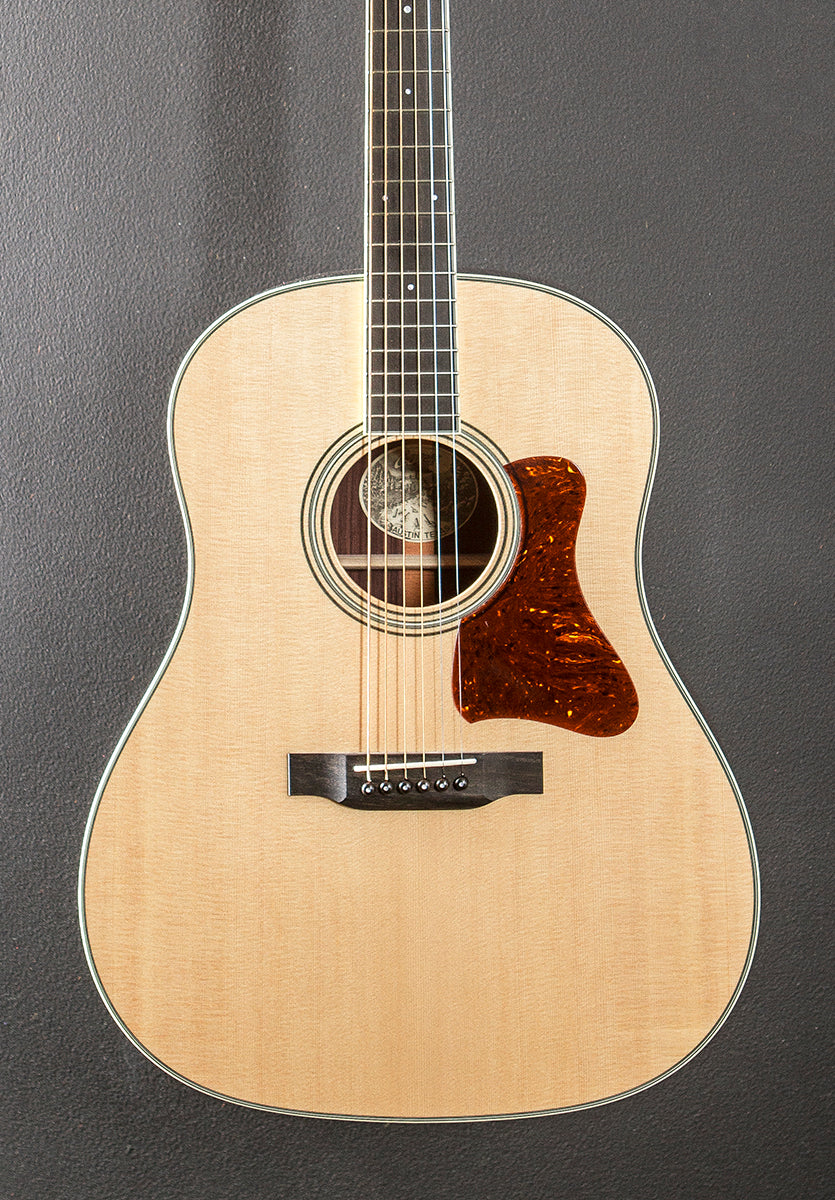 "The Collings Jumbo, or CJ, is our version of the classic slope-shouldered dreadnought, a shape that has enjoyed renewed popularity in recent years. While the CJ is similar in width and depth to the traditional dreadnought, it has a distinctly different tone. Despite its large size this model works well with the optional shorter string scale, resulting in a somewhat percussive bottom end ideal for acoustic blues or other styles that benefit from a more controlled bass response. Of all the Collings body shapes, this is the one most often requested with a sunburst top finish, and the wide range of wood options, neck widths, and string scales allow the CJ to be many different guitars to a wide variety of players."