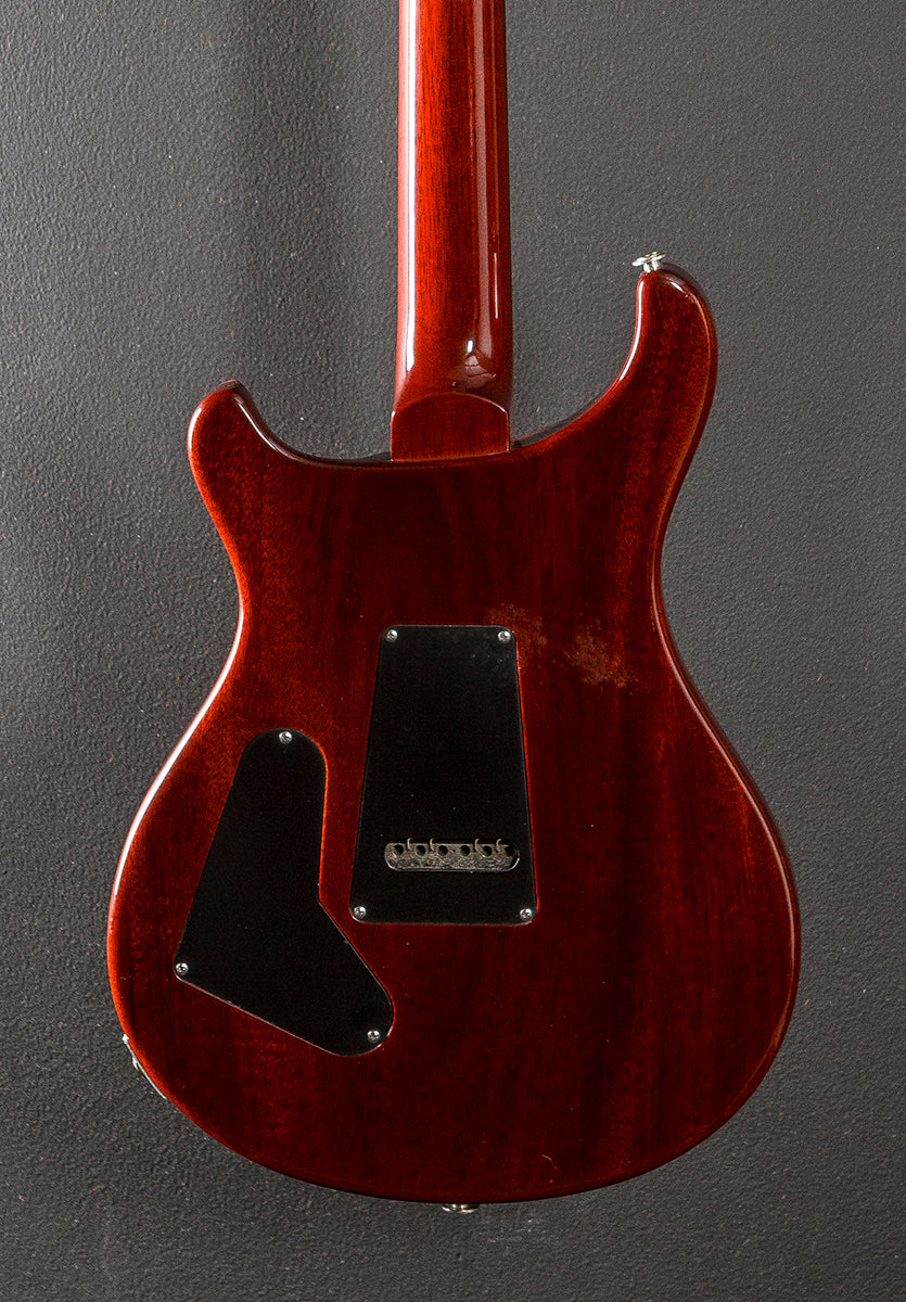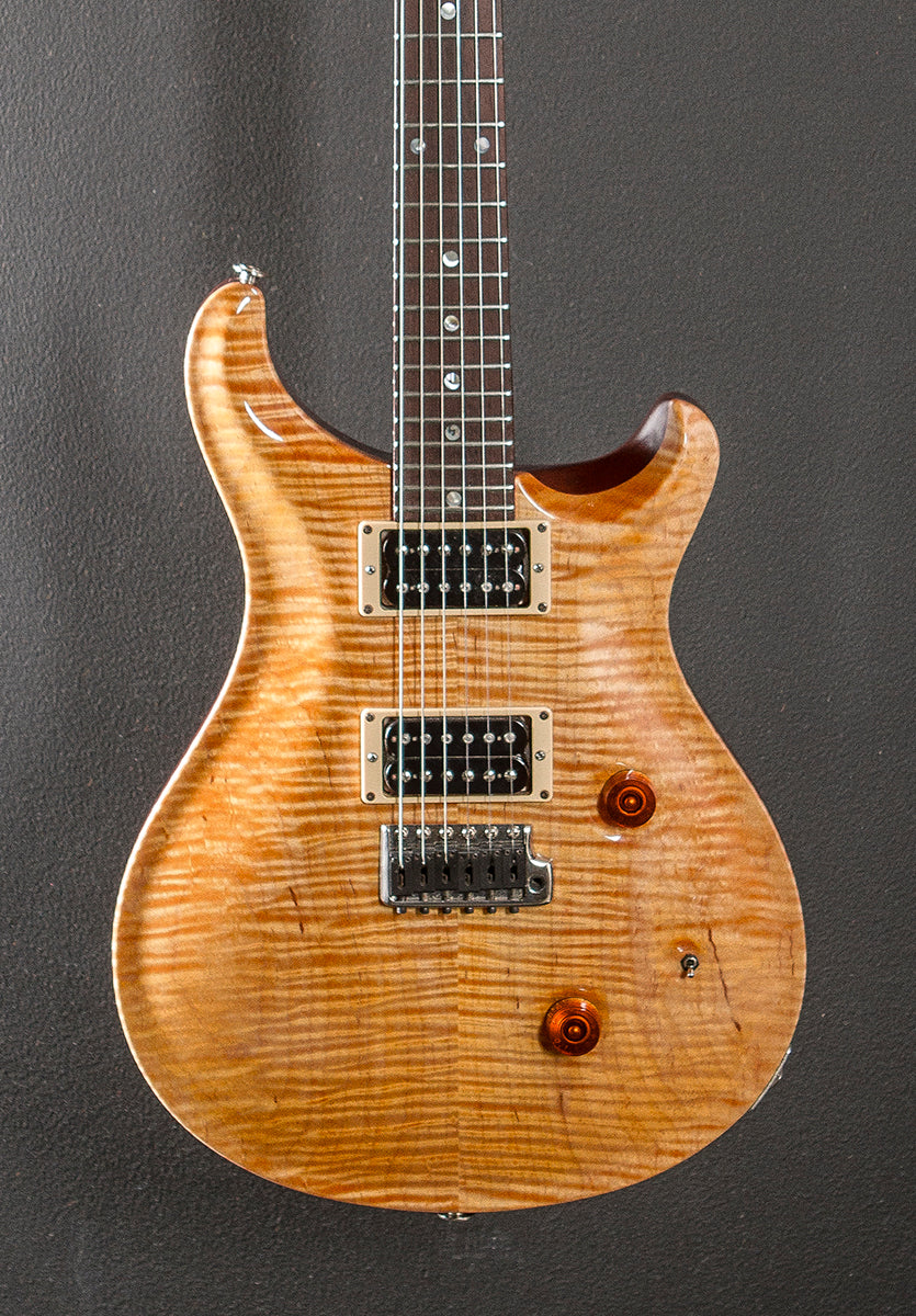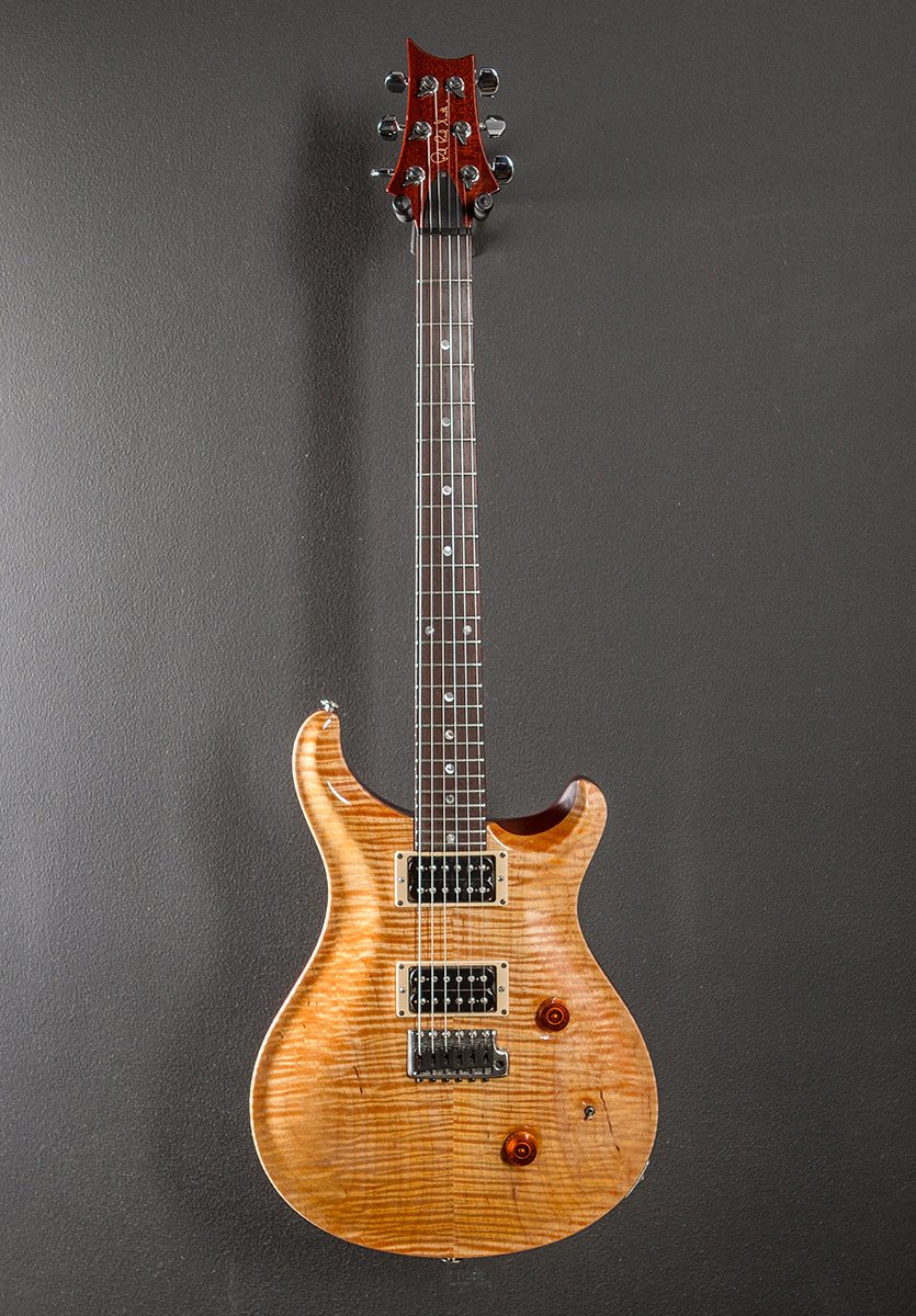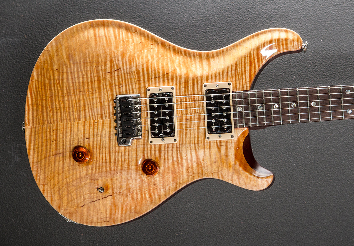 Vintage Yellow, Gloss finish, Carved figured Maple top, Mahogany body, Standard carved Mahogany neck, 10" radius Rosewood fingerboard with the Moon inlays, 25" scale length, 1 11/16th" nut width, Newer Seymour Duncan APH1 bridge and neck pickups were installed, 5-way rotary switching with the master volume and sweet switch, PRS tremolo with newer Graphtech saddles, Schaller/PRS locking tuners, The neck thickness is .82″ at the first and .91″ at the 12th frets, 8.2 pounds, With the PRS hardshell case, Very good