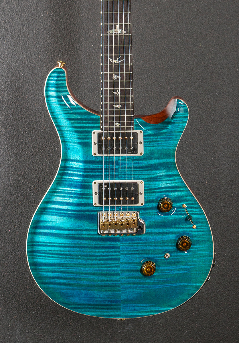 "The Custom 24 Piezo is a 24-fret solidbody piezo-equipped guitar that effortlessly achieves classic humbucker tones and authentic acoustic sounds in one instrument. With classic PRS appointments, including a figured maple top, mahogany back, 24-fret, 25” scale length mahogany neck with rosewood fretboard, PRS’s patented Gen III tremolo, and Phase III tuners with wing buttons, the Custom 24 Piezo is a unique tool for musicians in the writing room, the studio, and on the stage.