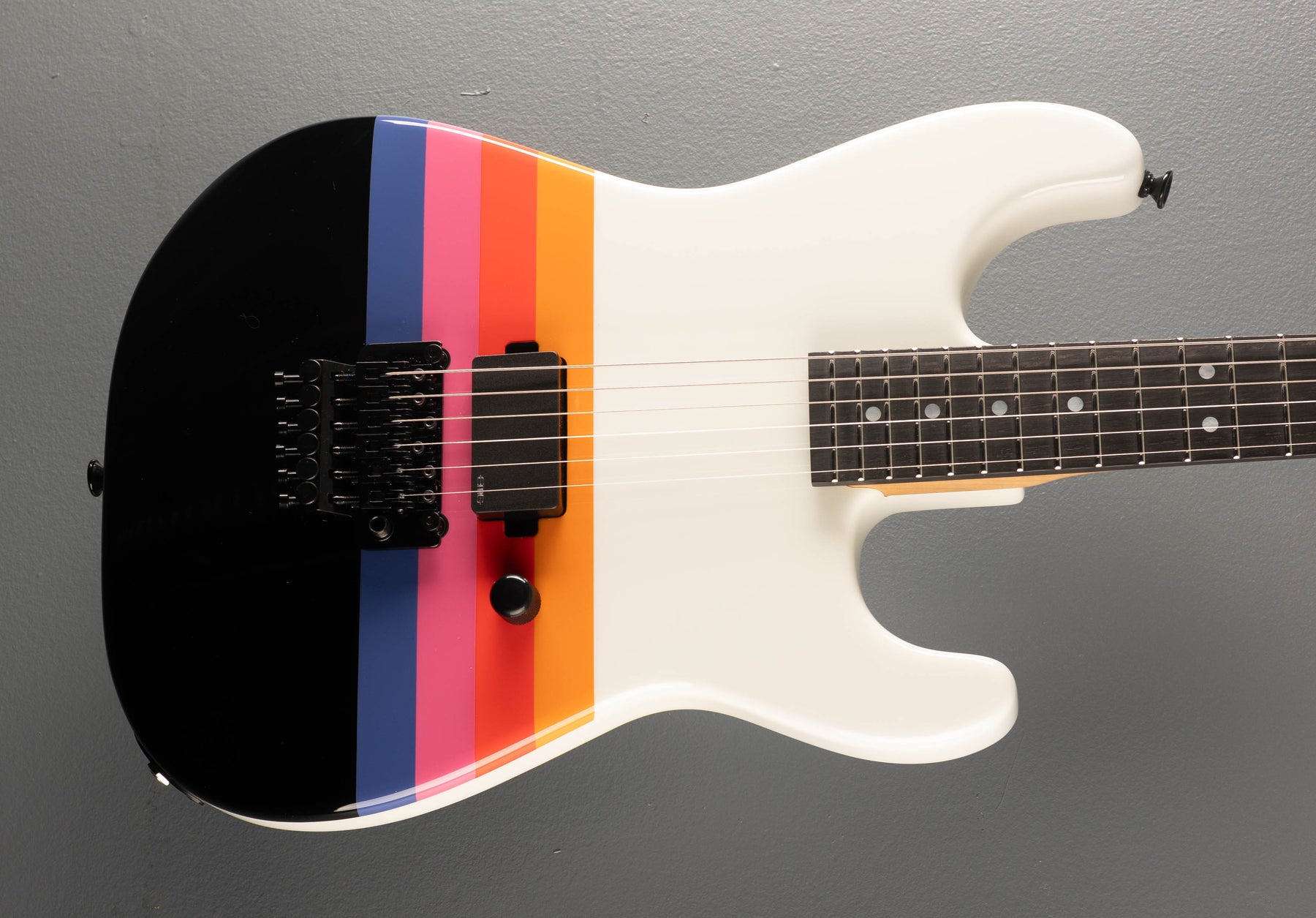 Custom VHS Graphic, Premium Alder Body, 12"-16" Compound Radius Ebony fingerboard with Mother of Pearl Dot inlays and Jumbo Stainless Steel frets on a Oil Finished Caramelized Quartersawn Maple Neck with Blue Luminlay Side dots, EMG 81 Bridge pickup with volume control, Floyd Rose Original Tremolo Bridge (Top Mount), Gotoh tuners, comes with COA and hardshell case.