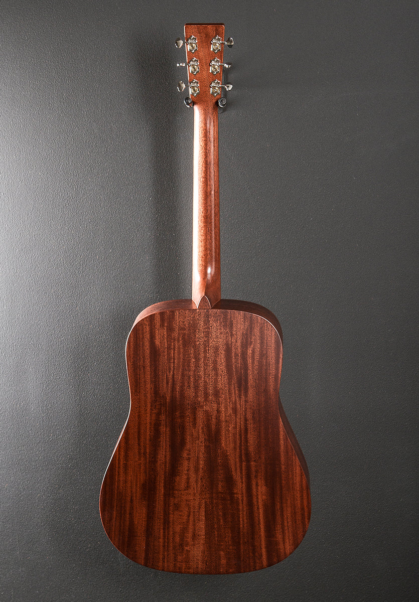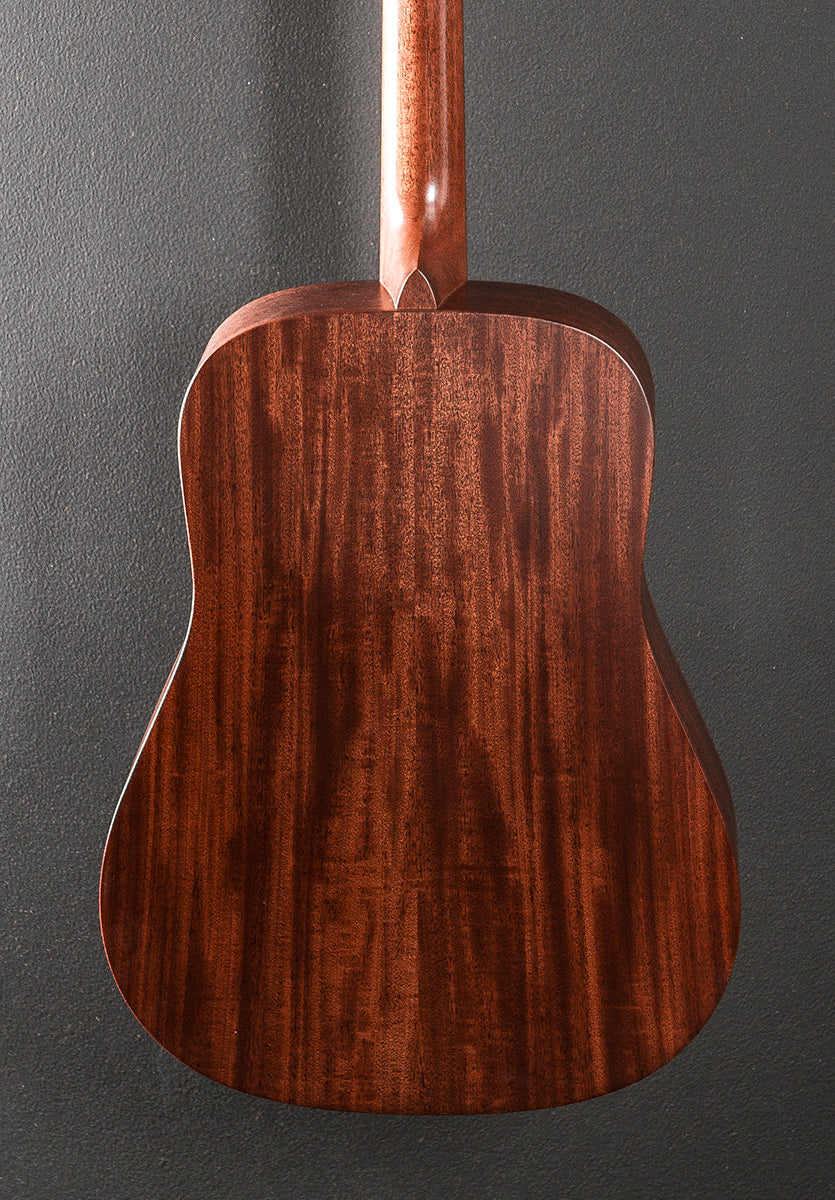 Dark Mahogany, Satin top/body and neck finish, D-14 Fret body shape, Mahogany top, Multi-stripe Rosette, Golden Era scalloped forward shifted X bracing, Mahogany back and sides, Golden Era modified low oval w/high performance taper shaped select hardwood neck, Ebony fingerboard with the Abalone Golden Era Diamond and Square short position markers, 25.4” scale length, 1 3/4” nut width, Grover open gear tuners, The neck thickness is .82″ at the first and .91″ at the 9th frets, With a soft case, Very good