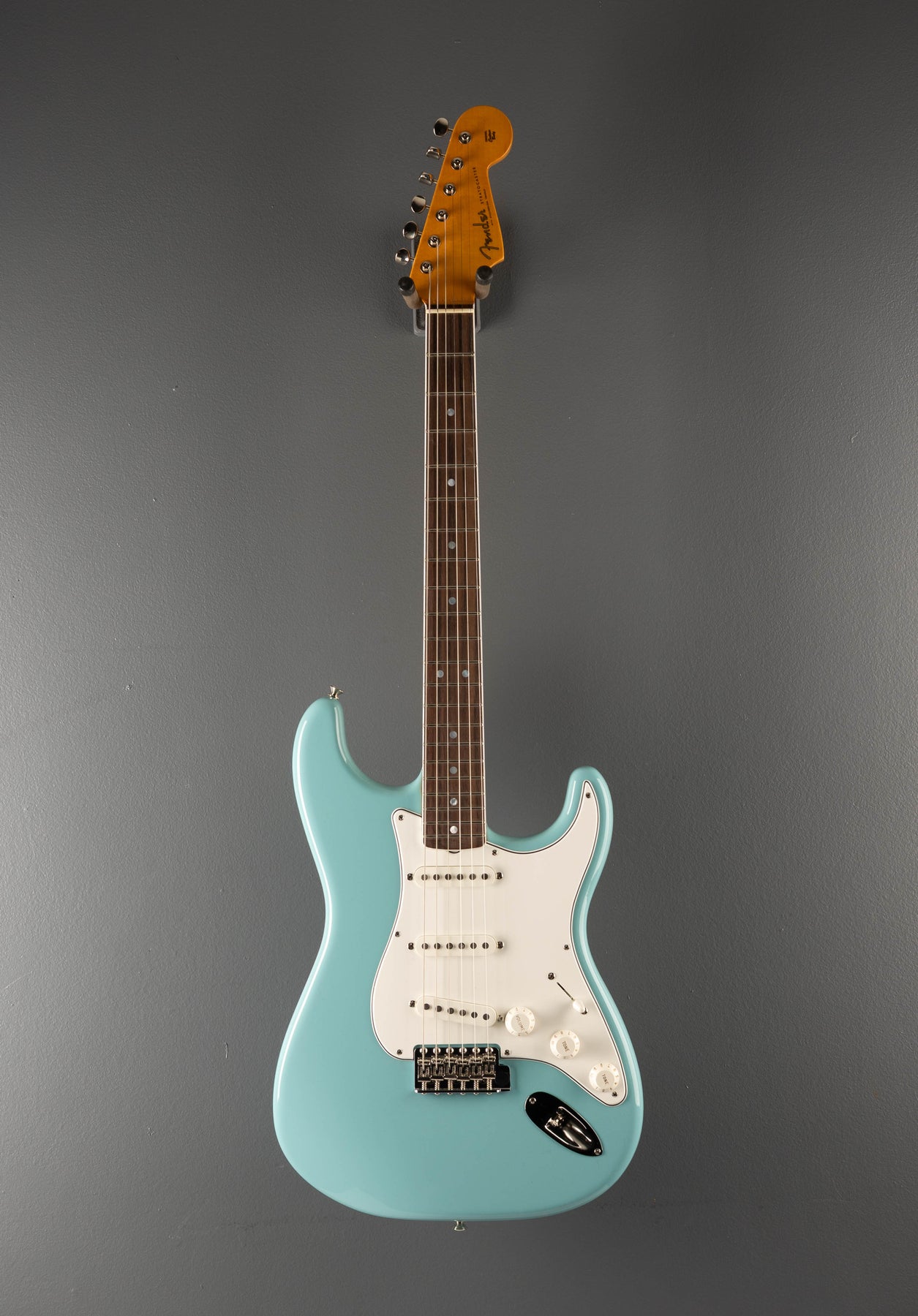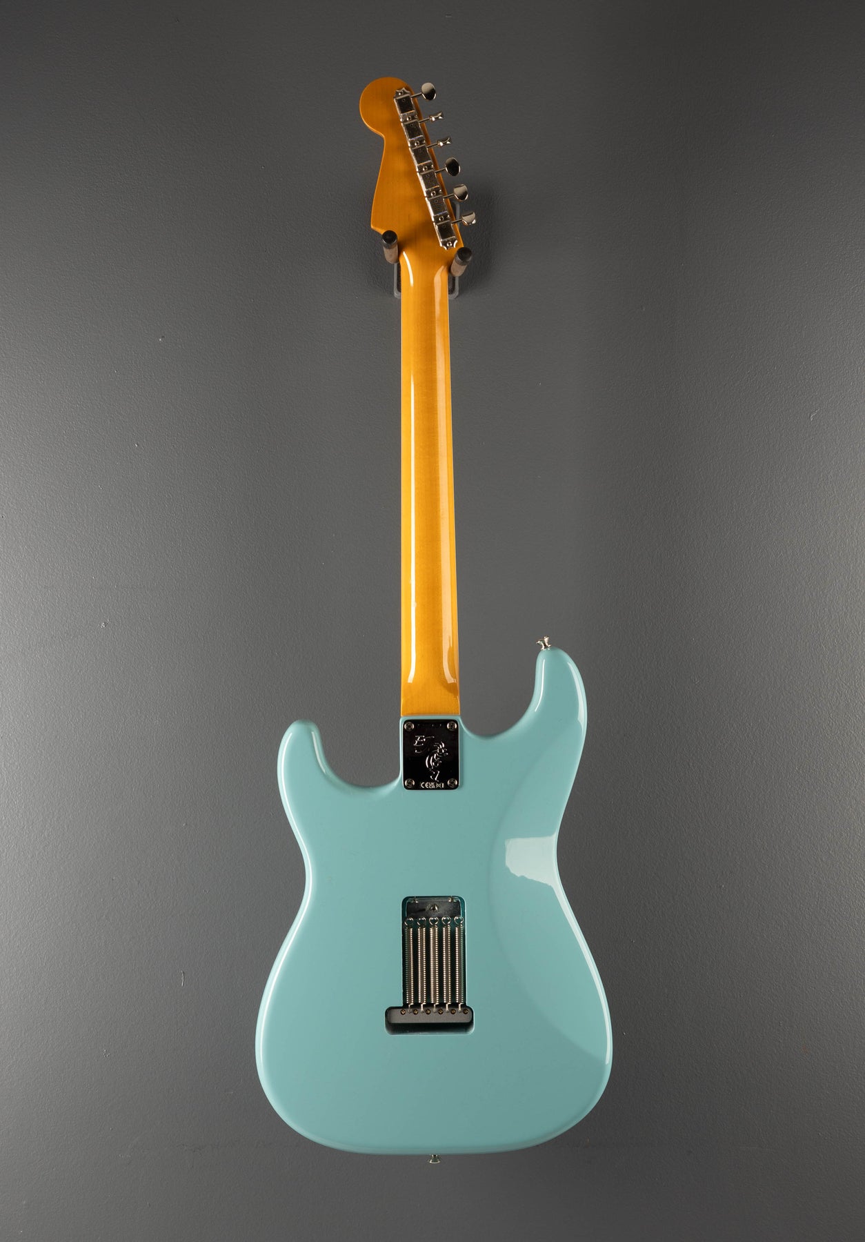 Tropical Turquoise, Gloss nitrocellulose lacquer finish, Alder body, Soft V shaped one piece quartersawn Maple neck with a bound 12” radius Rosewood fingerboard and medium jumbo frets, 25.5″ scale length, 1.650″ nut width, Specially voiced Eric Johnson single coil Strat pickups, 5-way switching with the master volume, tone 1. (neck pickup) and tone 2. (bridge pickup) controls, American Vintage synchronized tremolo with the bent steel saddles, Vintage style staggered tuners, 7.7 pounds, with hardshell case.