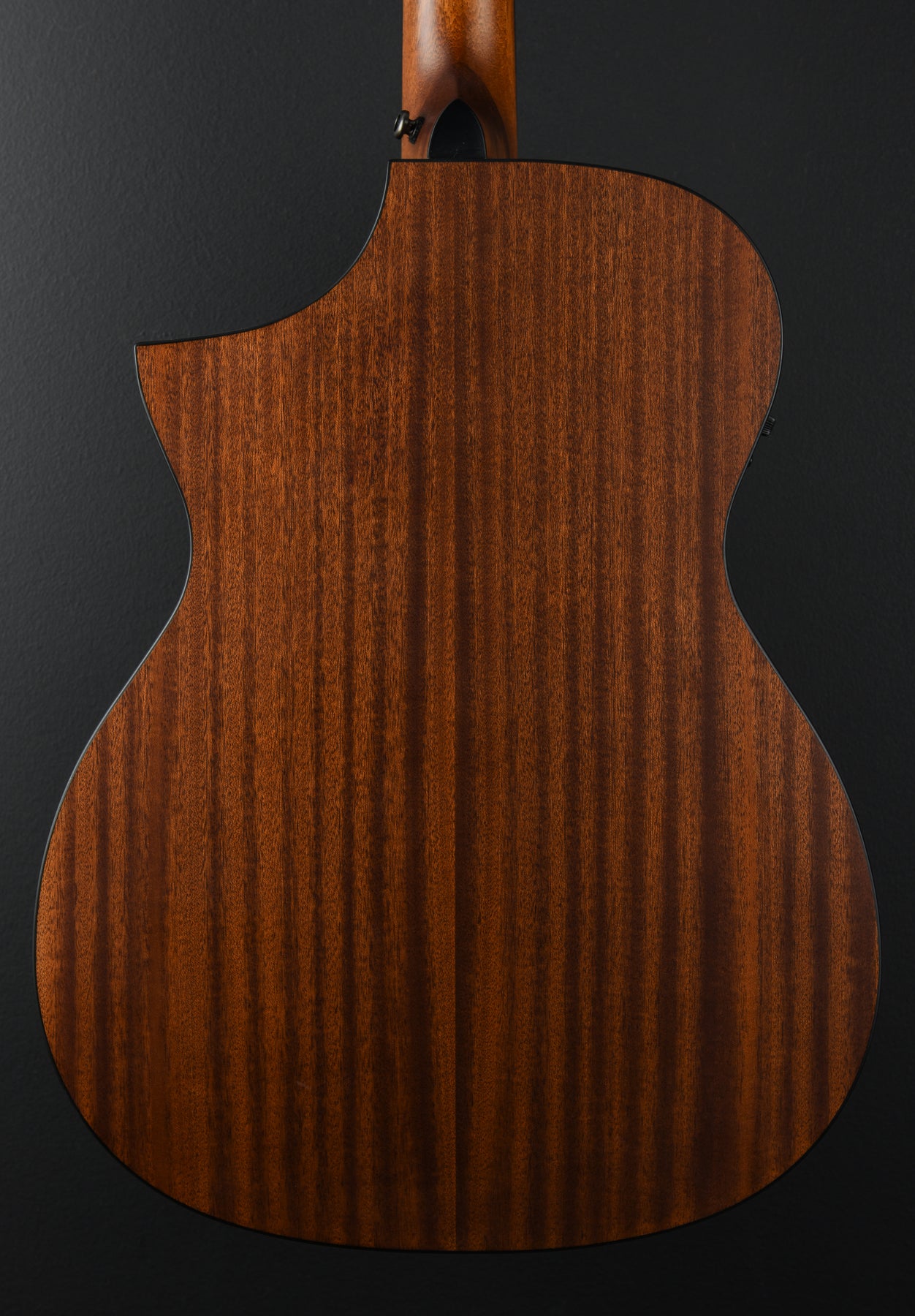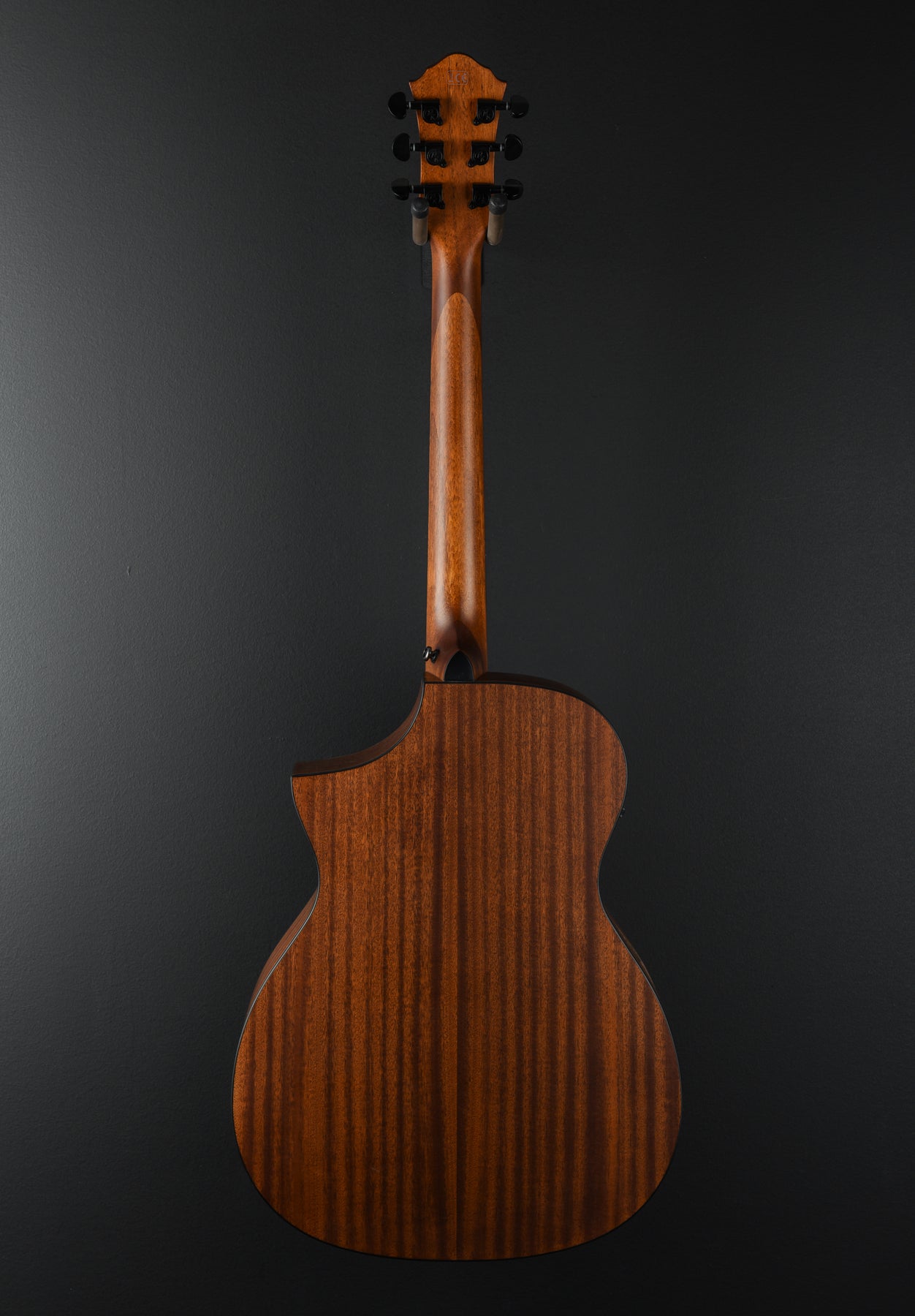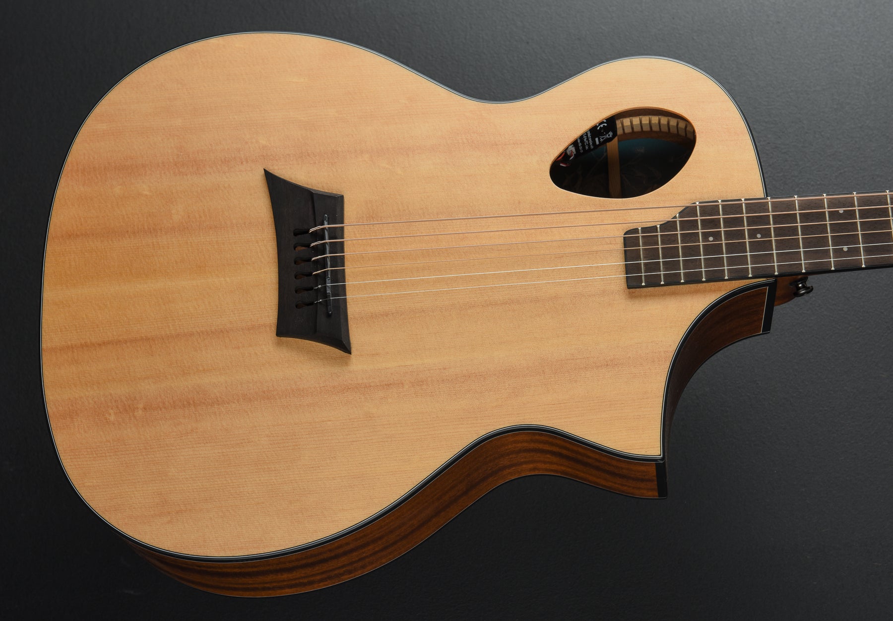 Natural, Matte finish, Solid Spruce top, Layered Sapele back and sides, Black binding, C shaped Mahogany neck, 12" radius Ovangkol fingerboard with the mini dot inlays and medium frets, 25.5" scale length, 1 11/16th" nut width, Cast/sealed tuners, Fishman Presys pickup system, Case not included