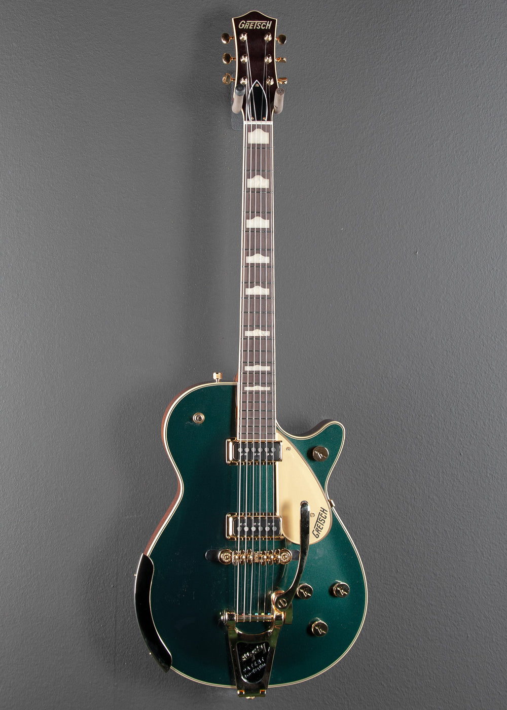 "Inspired by the pivotal and prolific years of Gretsch’s 1950s and early ’60s golden age, Vintage Select Edition guitars are designed for the player who appreciates the finest in musical instrument heritage. In smartly stylish Cadillac Green with gold hardware, the new G6128T-57 Vintage Select ’57 Duo Jet™ with Bigsby® rocks that legacy to perfection.