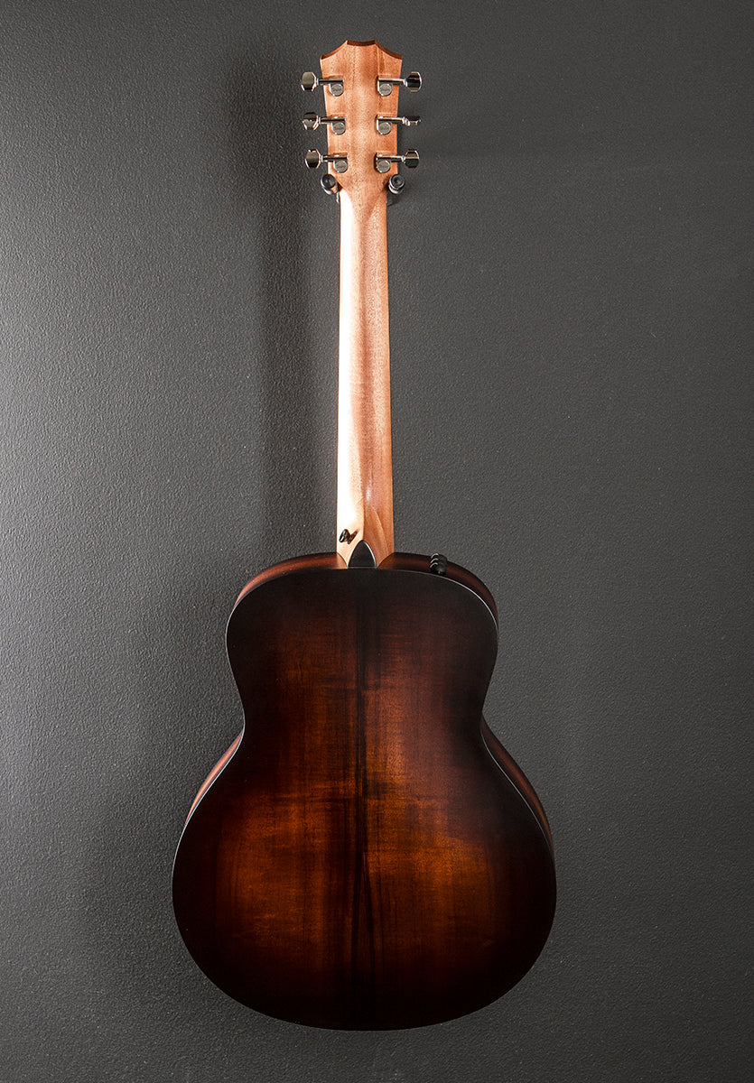 Shaded Edgeburst, Matte finish, Miniature Grand Symphony body shape, Hawaiian Koa top, Three Ring Plastic Rosette, GS Mini bracing, Layered Koa back and sides, West African Ebony fingerboard with the Italian Acrylic 4mm dot inlays on a Tropical Mahogany neck, 23.5″ scale length, 1 11/16th” nut width, Cast/sealed tuners, The neck thickness is .82″ at the first and .87″ at the 9th frets, With the Expression 2 pickup system and Aerocase hard bag, Excellent