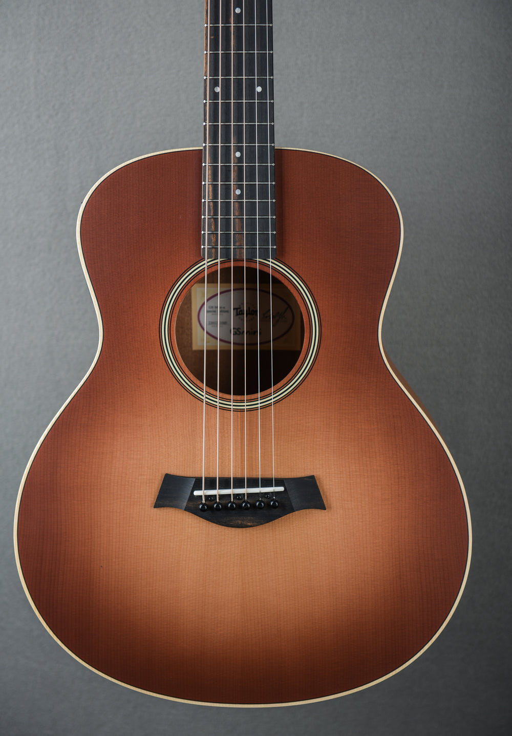 "A Carmel Burst top adds a rich complexion to this special-edition GS Mini, serving up a unique visual flourish to match its bold tone. A solid spruce top delivers clear, punchy sound with plenty of volume to hold its own alongside other musicians, while the compact body and short-scale, easy-playing Taylor neck offer an accommodating playing experience no matter your skill level. The onboard ES-B electronics feature a digital tuner to keep your pitch on point wherever you go, and this model includes a gig bag for easy portability."