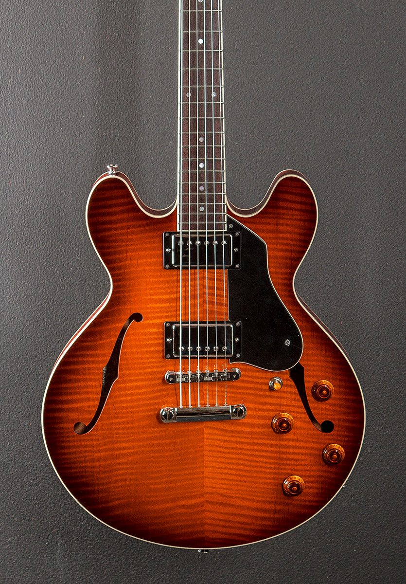 Brock Burst, Serial number I35241239, High gloss nitrocellulose lacquer finish, Semi-hollow body with the Maple center block, Premium Flame Maple top, Honduran Mahogany back and sides, Non-grained Ivoroid binding, Extra long mortise and tenon neck joint, C shaped Honduran Mahogany neck, Bound 12" radius Rosewood fingerboard with the Mother of Pearl long dot inlays and medium frets, 24 7/8th" scale length, 1 11/16th" nut width, Lollar Low Wind Imperial humbucking bridge and neck pickups with the 50's style wiring, Kluson ABR-1 tune-o-matic bridge and stop tailpiece, Gotoh/Collings tuners, 7.0 pounds, With the Ameritage hardshell case