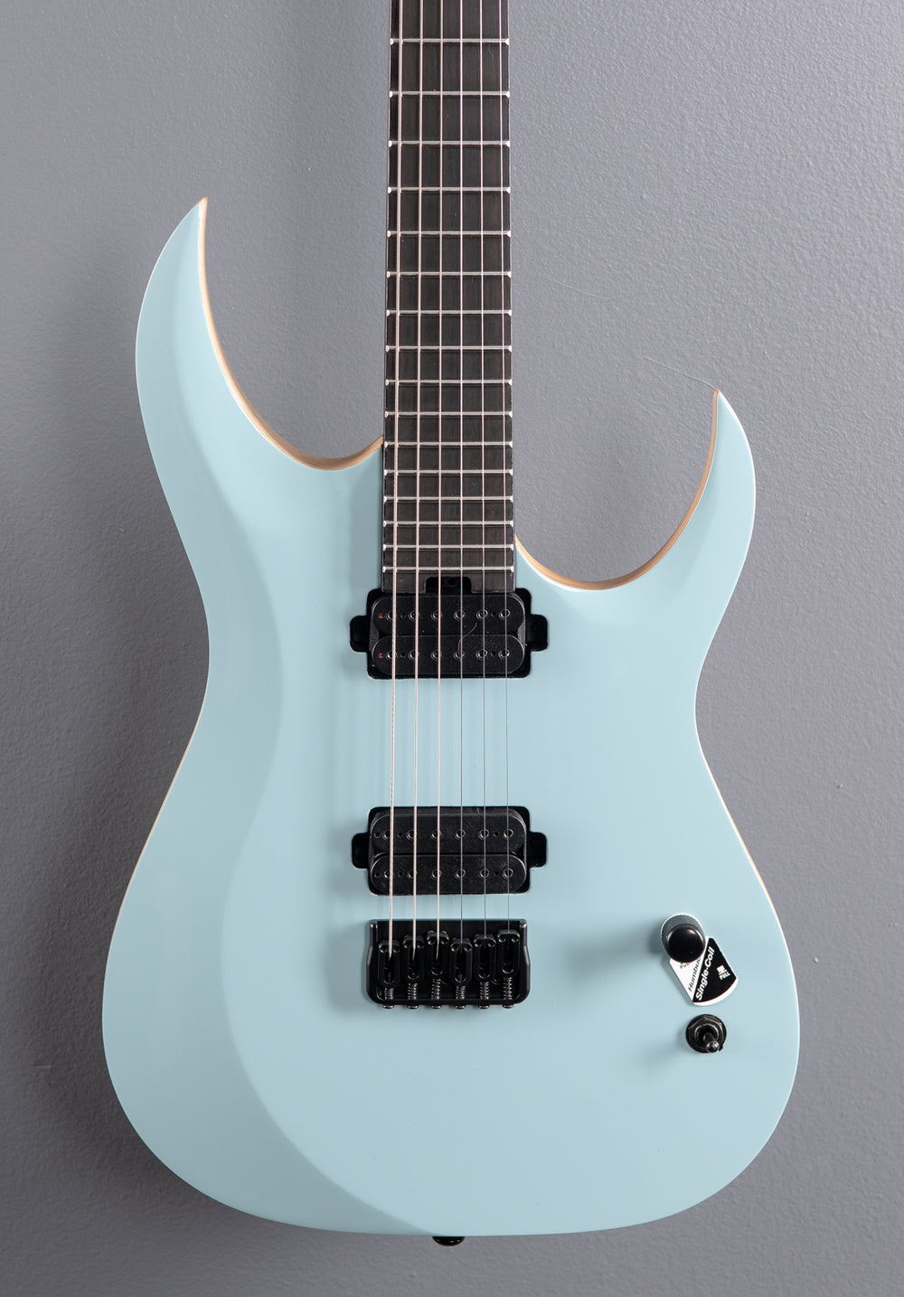 Azure, Swamp Ash body, Bound 16" radius Ebony fingerboard with extra jumbo stainless steel frets on a Ultra Thin U carved Wenge/Maple/Purpleheart multil-ply neck, 25.5" scale length, 1.653" nut width, Schecter USA Colossus bridge and Chaosbreaker neck pickups, 3 way switching with push pull coil tap master volume control, Hipshot Fixed Bridge, Hipshot Grip-Lock tuners, 7.0 pounds, case not included.