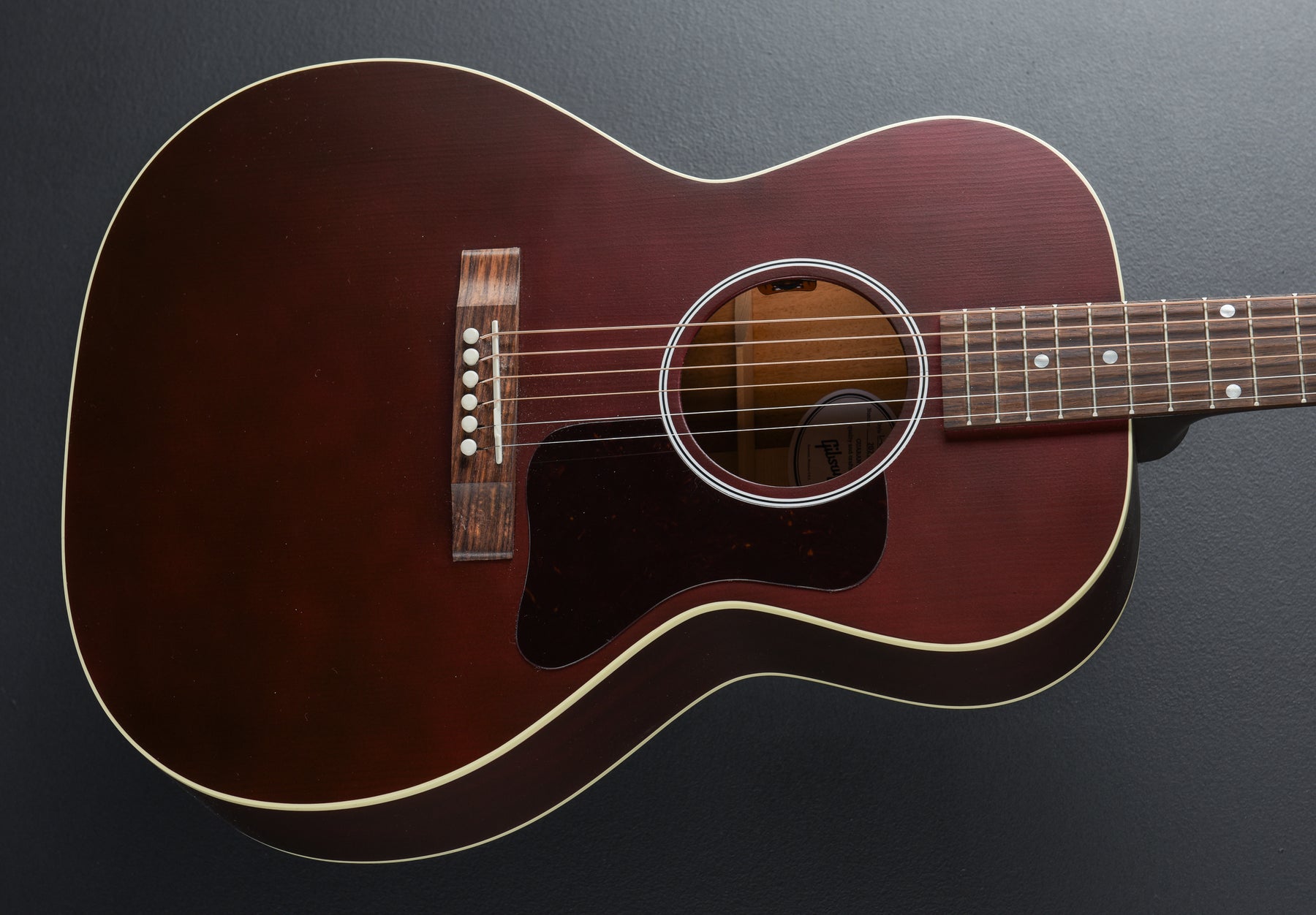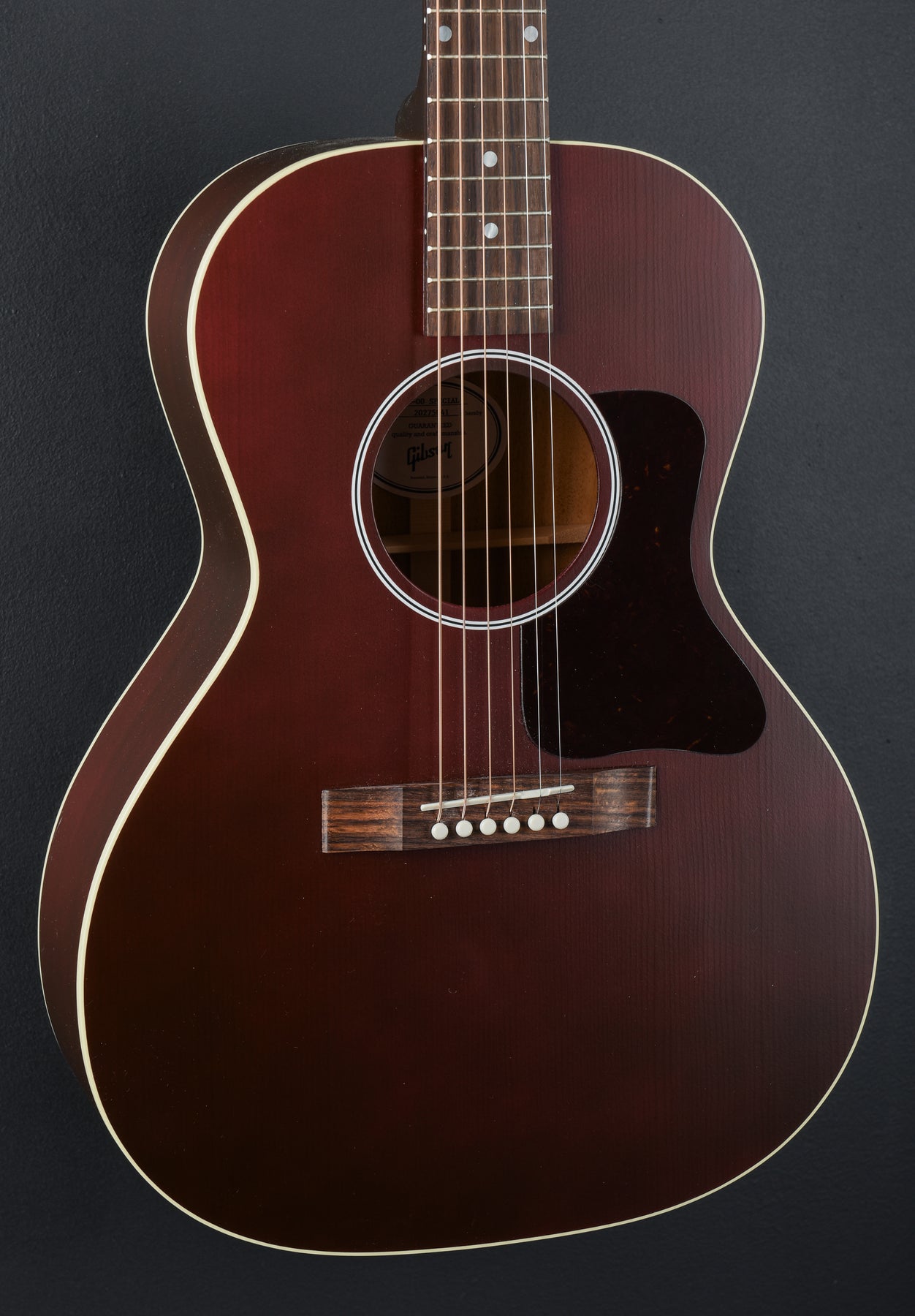 "First introduced in 1932, the L-00 has remained the most well-known and popular small-body acoustic model in Gibson’s illustrious history. The new L-00 Special is crafted by Gibson’s expert acoustic luthiers in Bozeman, Montana, and offers players a USA-built Gibson acoustic guitar at a very accessible price. The L-00 Special is constructed using genuine, solid mahogany for the back and sides and has a solid Sitka spruce top with our traditional scalloped X-bracing for a balanced tone with excellent dynamic range for a small-bodied acoustic. Both the top and back feature single-ply binding around the perimeter. The narrower waist of an L-00 body shape provides a focused and nuanced sound, naturally giving it a leaner and tighter bass response that sits perfectly in the mix. The tone is ideal for fingerstyle playing and blues and works very well for other genres and playing styles, too. The utile neck is attached to the body with a compound dovetail neck-to-body joint, and like all Gibson acoustic guitars, it is affixed with hot hide glue. The neck has a comfortable and fast-playing Slim Taper™ profile, and the rosewood fretboard has a 12” radius and is adorned with simple mother-of-pearl dot inlays and is fitted with 19 standard frets. The closed slot rectangular rosewood bridge is equipped with a TUSQ® saddle, and the nut and bridge pins are also TUSQ. Smooth turning Grover® Mini Rotomatic® tuners ensure solid tuning stability. The L-00 Special is finished in satin nitrocellulose lacquer in your choice of Satin Vintage Sunburst or Satin Wine Red. It comes equipped with an L.R. Baggs™ Element Bronze active under-saddle piezo pickup and active preamp with an easy-to-access soundhole-mounted volume control, so it’s stage and studio-ready from the moment you take it out of the included premium softshell case."