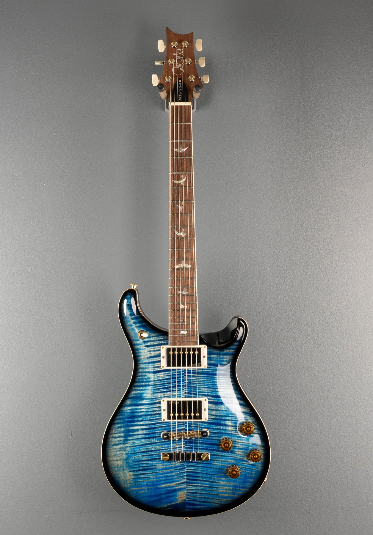 Faded Blue Jean Smokeburst, High gloss nitro finish, Violin carved Flame Maple 10 top, Mahogany body, Pattern Vintage carved Mahogany neck, 10″ radius Rosewood fingerboard with the Bird inlays and faux Bone binding, 24.594″ scale length, 1 11/16th” nut width, the neck measures .88" at the 1st and .97" at the 12th frets, PRS McCarty III bridge and neck pickups, 3-way toggle switching with the volume and push/pull coil tap tone controls for each pickup, PRS two-piece bridge and PRS Phase III Non Locking tuners, 7.9 pounds, With hardshell case