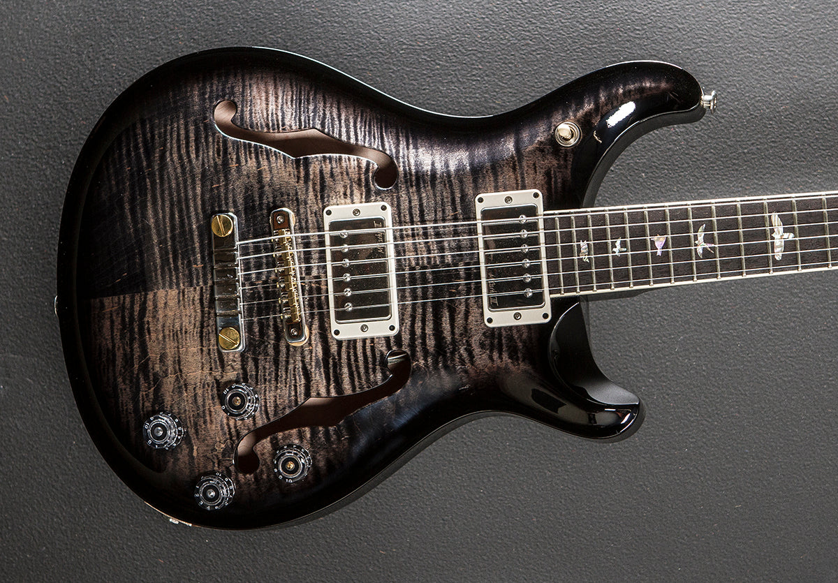Charcoal Wraparound Smokeburst, High gloss nitro finish, Violin carved figured Maple top and back, Mahogany body core, Pattern Vintage carved Mahogany neck, 10″ radius Rosewood fingerboard with the Bird inlays and faux bone binding, 24.594″ scale length, 1 11/16th” nut width, PRS McCarty III bridge and neck pickups, 3-way toggle switching with the volume and push/pull coil tap tone controls for each pickup, PRS two-piece bridge, PRS Phase III non-locking tuners with the wing buttons, The neck thickness is .85″ at the first and .96″ at the 12th frets, 6.0 pounds, With the PRS hardshell case, Excellent