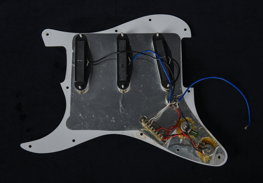 S-Style loaded pickguard, master volume and two tone pots. Single coil neck/middle/bridge pickups.