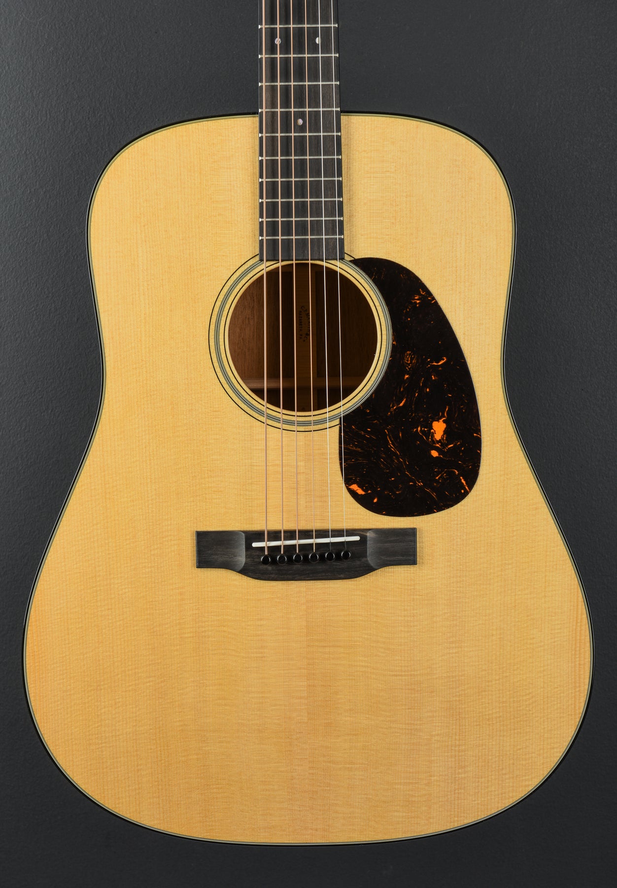 "The Martin D-18 is one of the most iconic guitars in Martin’s lineup, trusted by legends of music and players like you for nearly a century. Known as a tried-and-true workhorse, its Dreadnought size delivers the bold, projective tone and strong bass that have shaped countless performances and recordings. Handcrafted with a solid spruce top and solid mahogany back and sides, the D-18 offers a full and balanced voice with bright trebles, a punchy midrange, and exceptional clarity in an iconic, no-frills design that has always delivered. The satin neck with a Golden Era (GE) Modified Low Oval profile, high-performance taper, and 25.4" scale length ensures unmatched comfort and playability. Elegant ebony details, including the bridge, bridge pins, and fingerboard with abalone dot inlays, complement its timeless style. Available in a variety of gloss and satin options, the D-18 is a guitar you can trust to unleash the artist within.