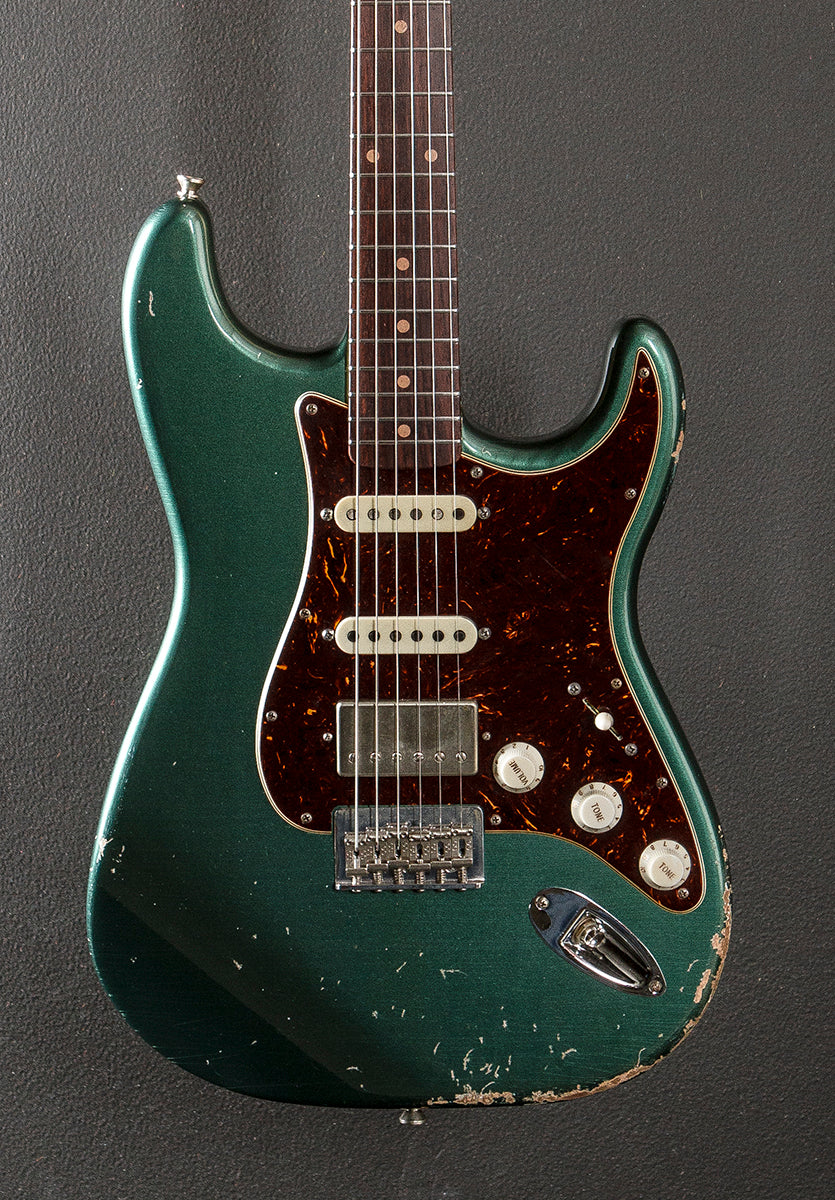 Sherwood Green, Handmade in Kansas City, Heavy aged nitrocellulose lacquer finish, Alder body, 60's thin C shaped Maple neck with a 10" radius Rosewood fingerboard and Jescar 47095 frets, 25.5" scale length, 1 5/8th" nut width, Fountain City Guitarworks A6 PAF bridge and Deacon Blues S middle/neck pickups, 5-way switching with the volume/tone/tone controls, Callaham string thru body hardtail bridge with the bent steel saddles, Gotoh SDS-510 tuners, The neck thickness is .78″ at the first and .92″ at the 12th frets, 7.0 pounds, With hardshell case