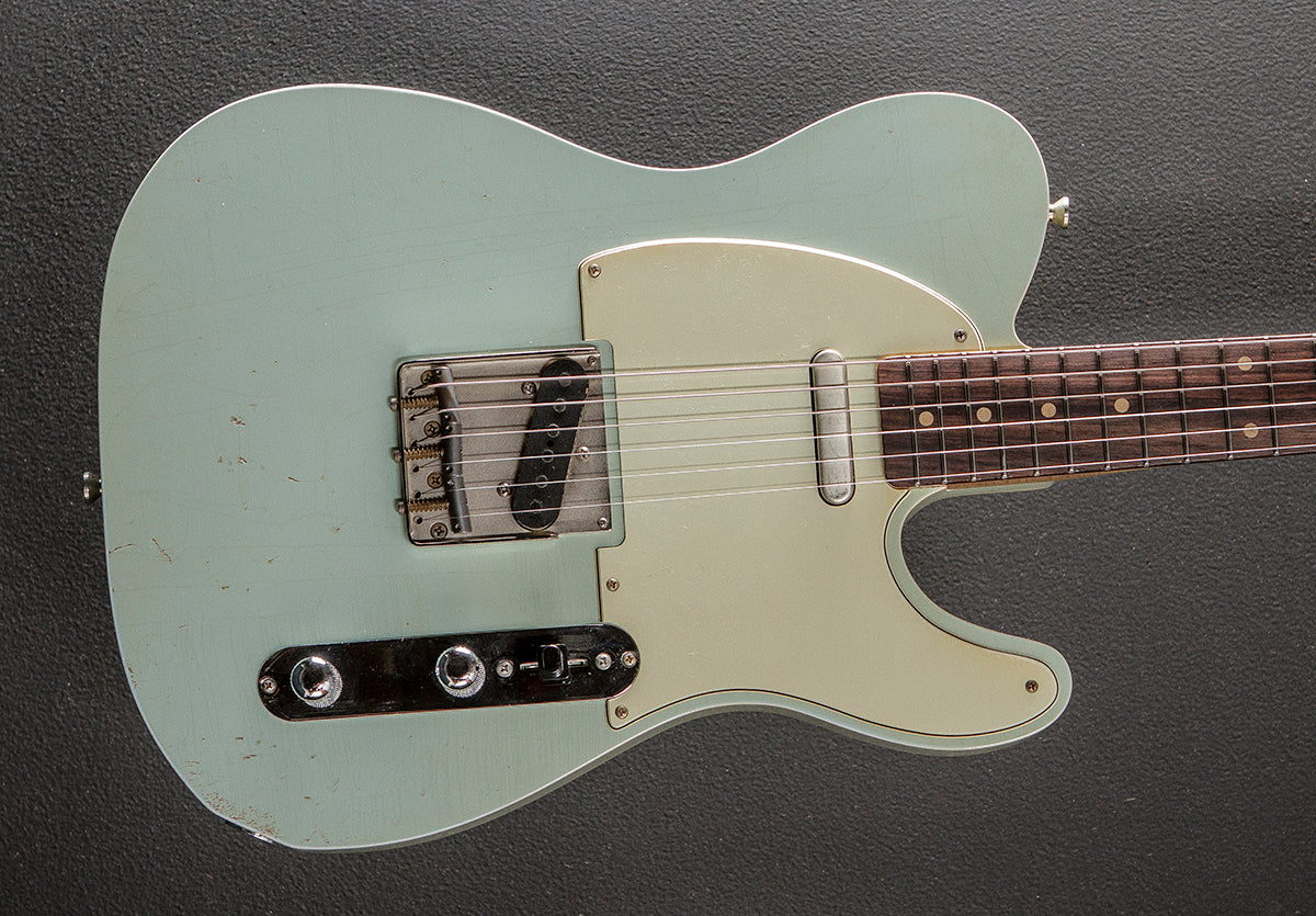 Aged Sonic Blue, Handmade in Kansas City, Aged nitrocellulose lacquer finish, Double bound Alder body, C shaped Maple neck with a 10" radius Rosewood fingerboard and Jescar 47095 frets, 25.5" scale length, 1 5/8th" nut width, Fountain City Guitarworks Deacon Blues T bridge and neck pickups, 3-way switching with the master volume and tone controls, Glendale string thru body T bridge with the three compensated steel saddles, Gotoh SDS-510 tuners, The neck thickness is .86″ at the first and .95″ at the 12th frets, 7.8 pounds, With hardshell case