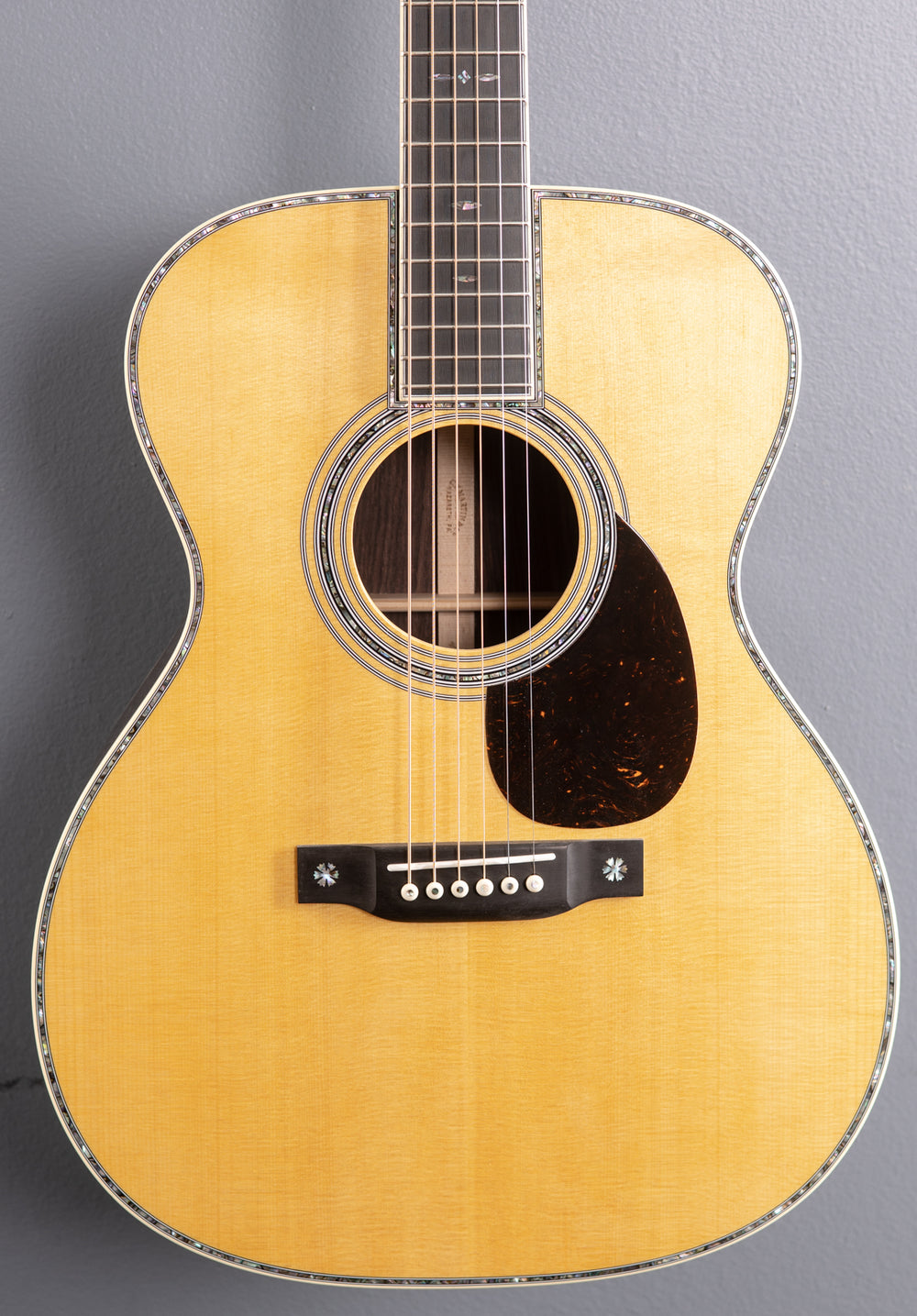 Natural, 000-14 Fret body shape, Solid Sitka Spruce top, Scalloped X bracing, Abalone with the multi-stripe Rosette, Solid East Indian Rosewood back and sides, Style 45 back purfling, Grained Ivoroid binding with the Abalone w/multi-stripe top inlay, Multi-stripe back and side inlay, Ebony fingerboard with the Abalone Style 45 Snowflake position markers on a modified low oval w/high performance taper shaped Mahogany neck, 25.4” scale length, 1 3/4" nut width, With hardshell case