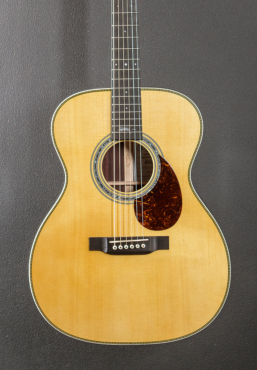 Natural, 000-14 Fret body shape, Solid Engelmann Spruce top, Scalloped X bracing, Abalone with multi-stripe Rosette, East Indian Rosewood back and sides, Zig-Zag back purfling, Grained Ivoroid binding with the Bold Herringbone top and multi-stripe back inlay, Ebony fingerboard with the custom Mother of Pearl position markers on a low profile w/standard taper shaped select hardwood neck, 25.4″ scale length, 1 11/16th” nut width, With the Martin Gold Plus Natural 1 pickup system and hardshell case