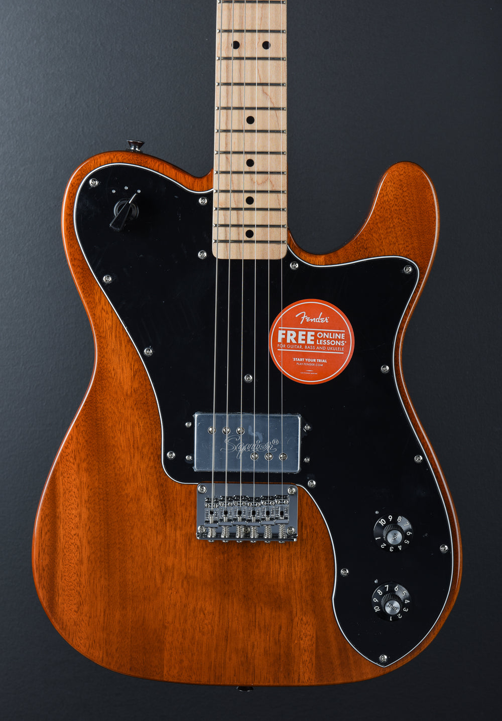 Mocha, Crafted in China, Poplar body, Gloss polyurethane finish, C shaped Maple neck with a 9.5” radius Maple fingerboard and narrow tall frets, 25.5" scale length, 1.650" nut width, Fender designed Wide Range humbucking bridge pickup, 3-position rotary switch: (position 1. humbucker bypasses the volume and tone controls, position 2. humbucker, position 3. inner coil of humbucker only) plus the master volume and tone controls, String thru body Tele bridge with the bent steel saddles, Vintage style tuners, 7.3 Pounds, Case not included
