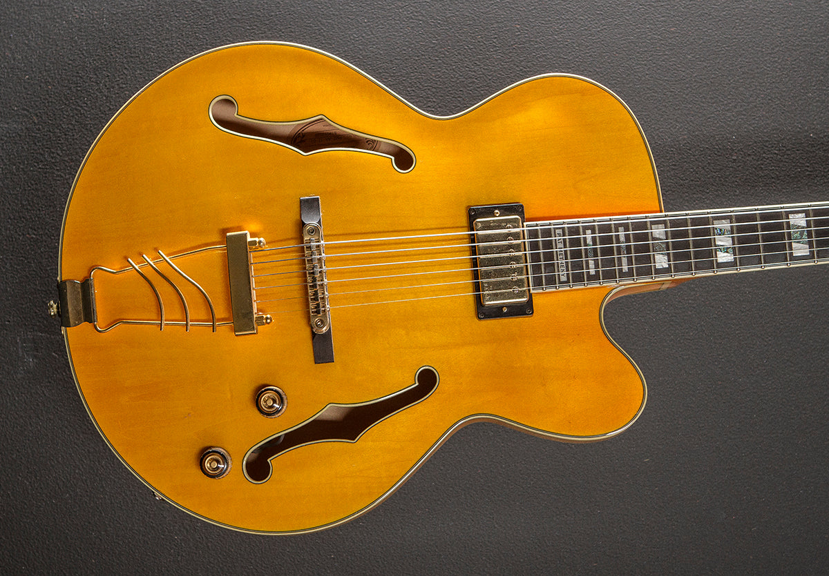 Antique Amber, Gloss finish, 15.75" wide hollow laminated Maple body, Multi-ply top and back binding, PM shaped three piece Mahogany/Maple neck, Bound 12" Ebony fingerboard with the Pearl/Abalone block inlays and medium frets, 24.75" scale length, 1 11/16th" nut width, Ibanez Super 58 neck pickup with the master volume and tone controls, ART-1 bridge with the wood base, KT30 trapeze tailpiece and cast/sealed tuners, The neck thickness is .81″ at the first and .90″ at the 9th frets, With hardshell case, Very good