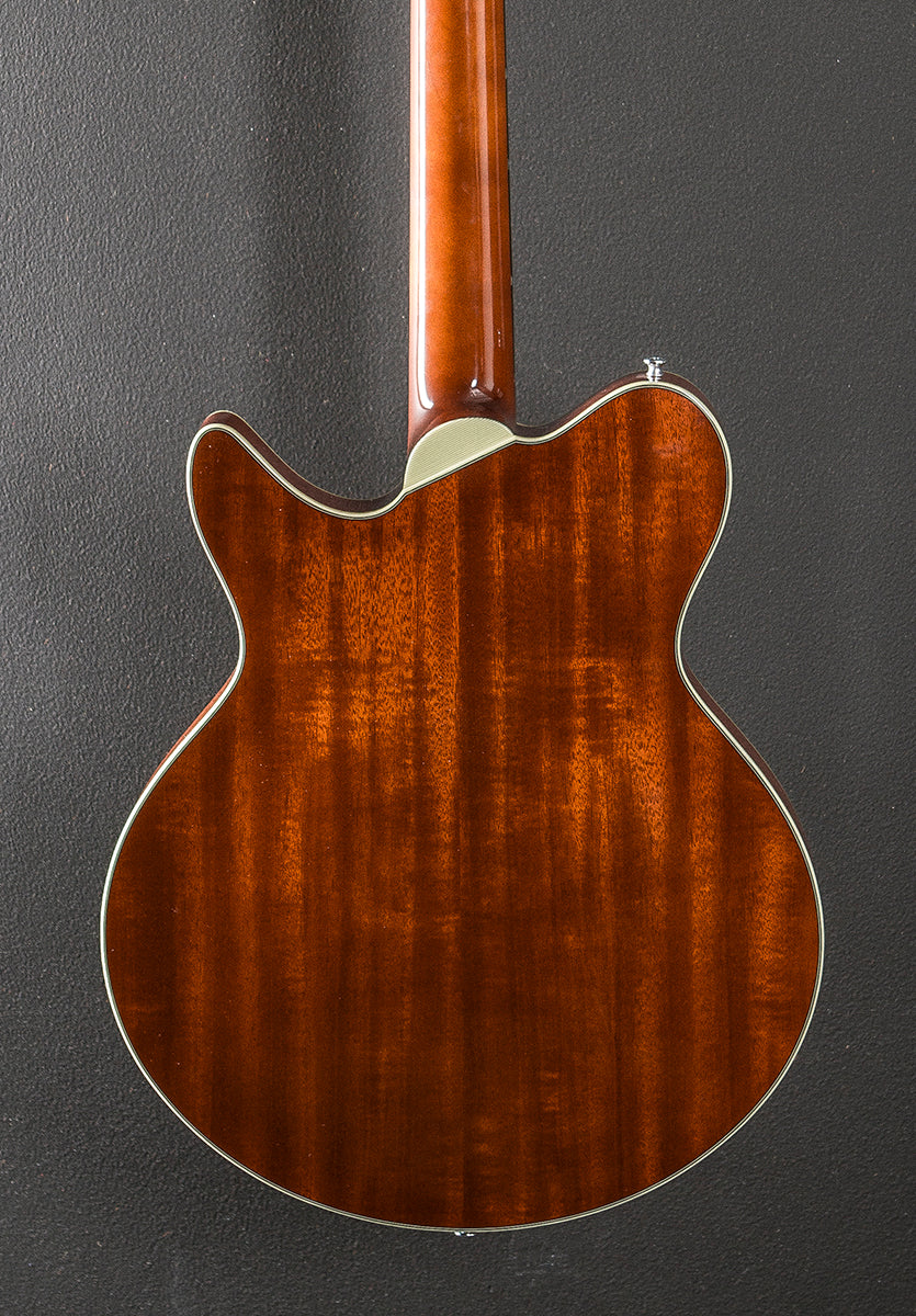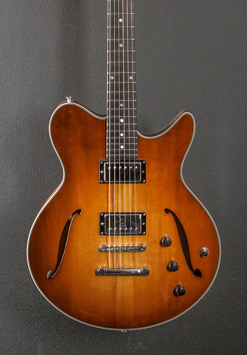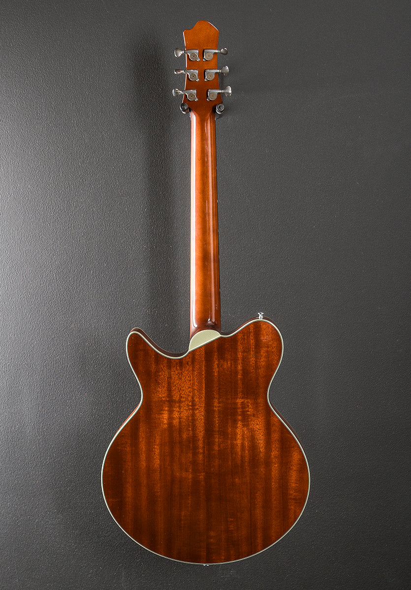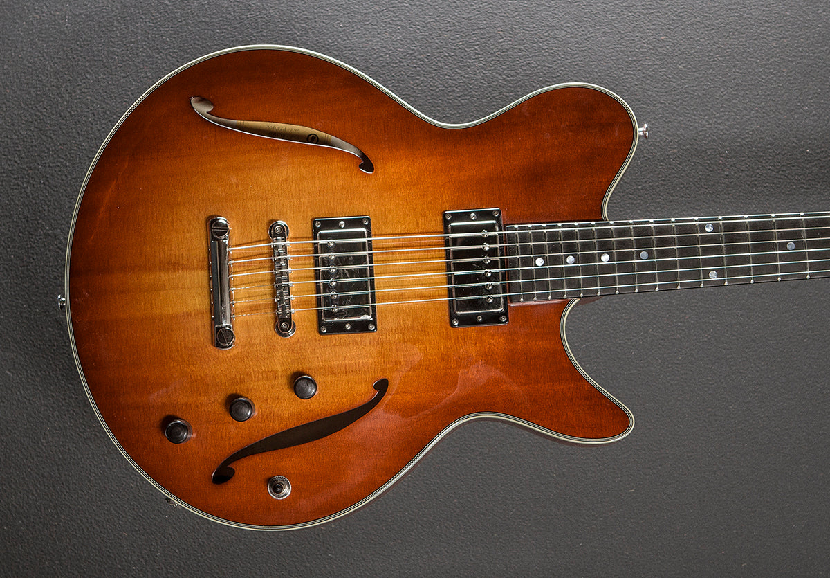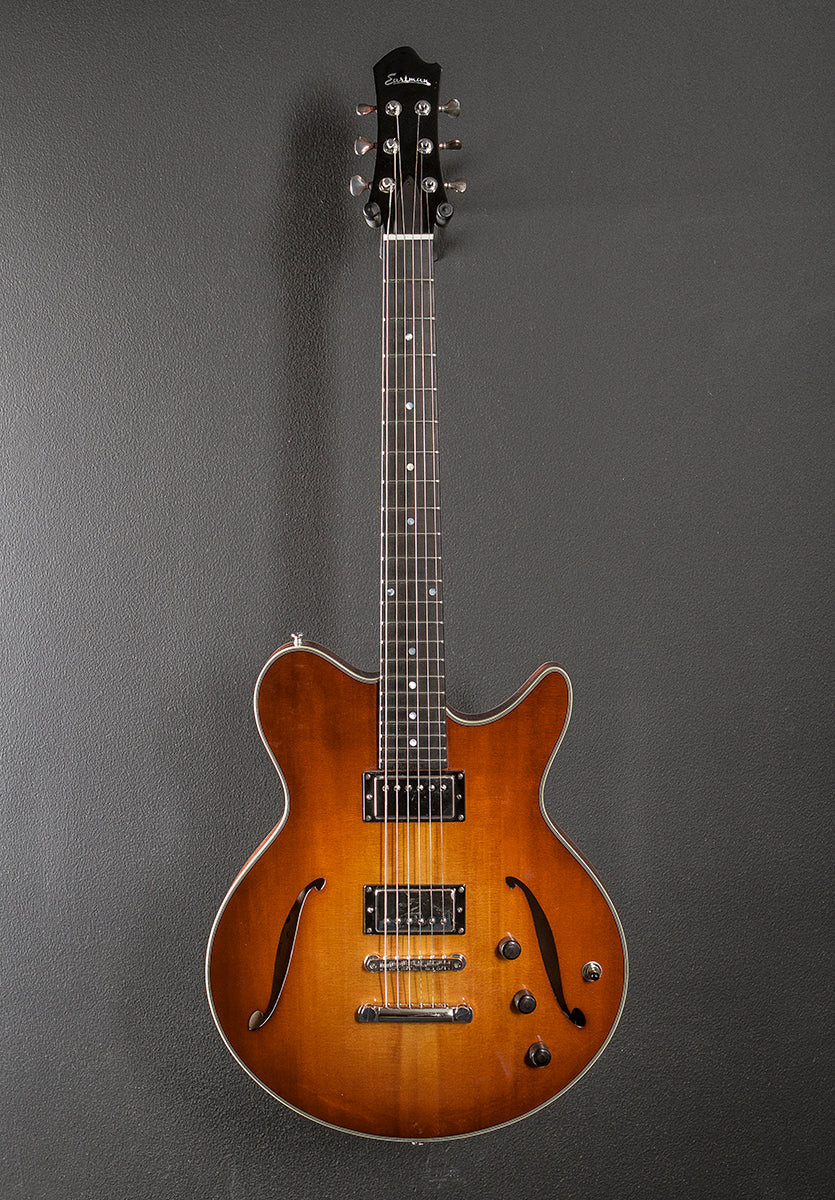 Gold Burst, Gloss finish, Hollow body, Solid Spruce top and laminated Mahogany back/sides, Multi-ply Ivoroid/Black binding, 12” radius Ebony fingerboard with the pearl dot inlays on a traditional even C shaped Maple neck, 24.75” scale length, 1 11/16th” nut width, Lollar custom wound Imperial humbucking bridge and neck pickups, 3-way toggle switching with the volume/volume/tone controls, Gotoh tune-o-matic bridge and stop tailpiece, Gotoh tuners, The neck thickness is .85″ at the first and .92″ at the 12th frets, 5.6 pounds, With the Eastman hardshell case, Excellent