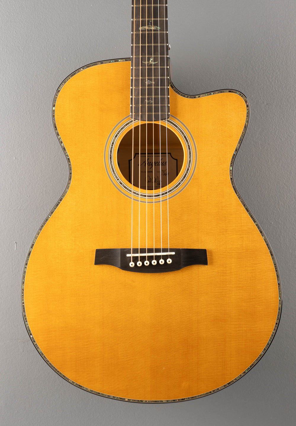 Very Good Condition, Natural w/Black Gold Burst, Angelus cutaway body shape, Solid Sitka Spruce top, PRS Hybrid “X”/Classical bracing pattern, Abalone with Black/White Rosette, Flame Maple back and sides, Black/White binding with the Abalone top purfling, 11.81″ radius Ebony fingerboard with Bird inlays on a Wide/Fat shaped Mahogany neck, 25.3″ scale length, 1 11/16th” wide bone nut, With the factory Fishman GT1 pickup system and hardshell case.