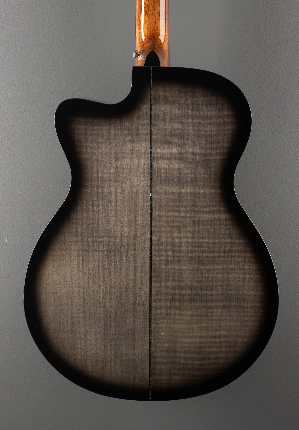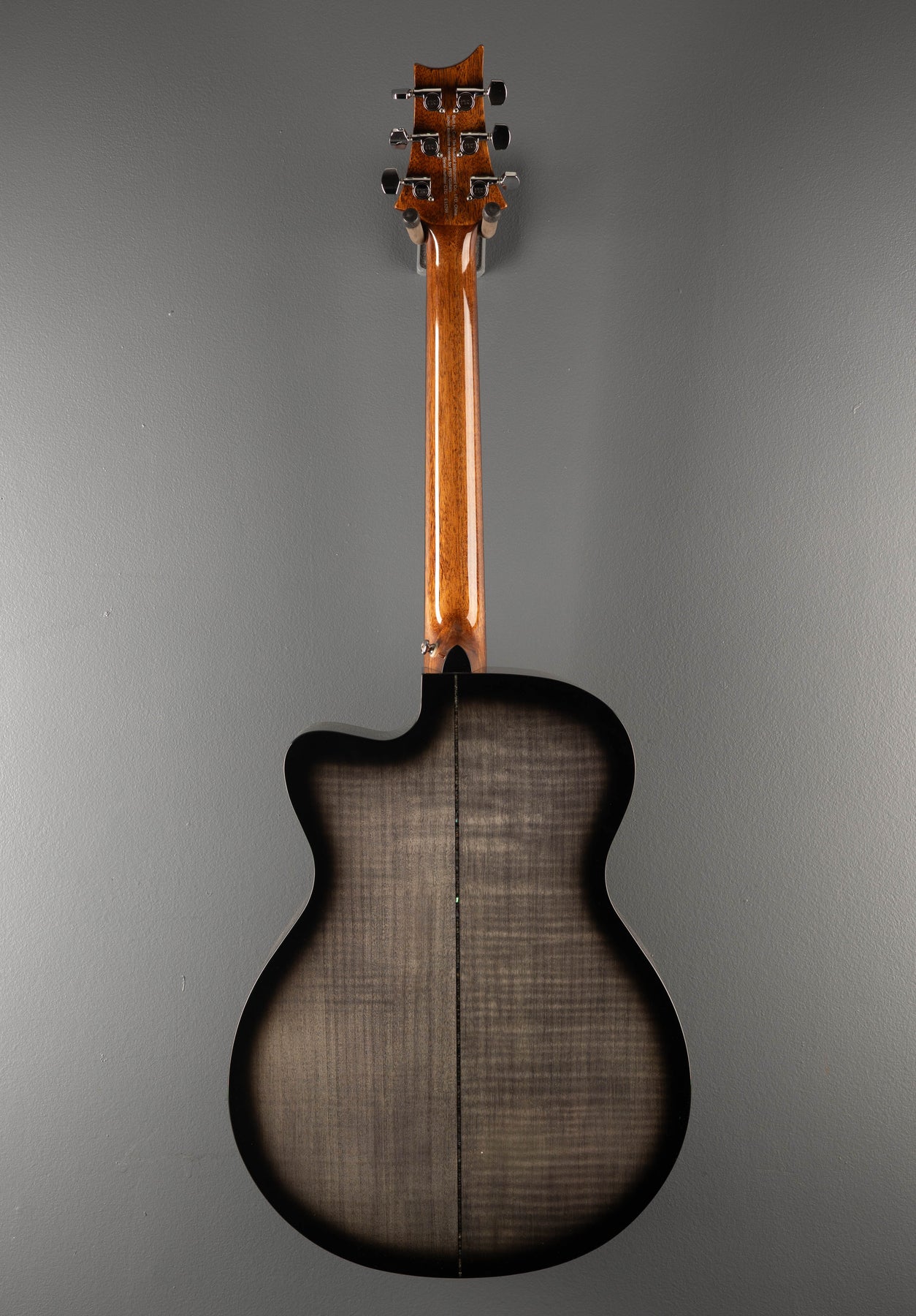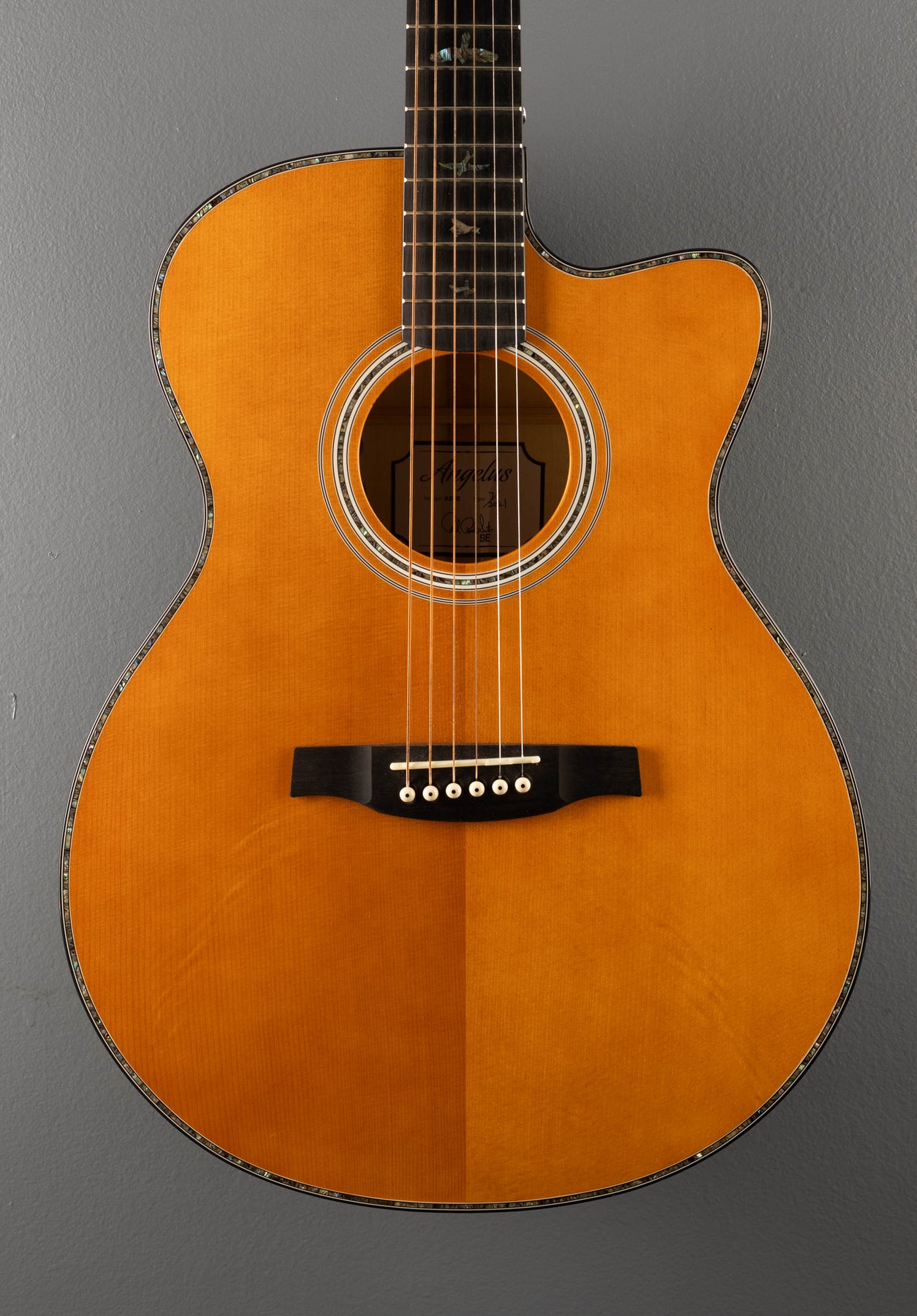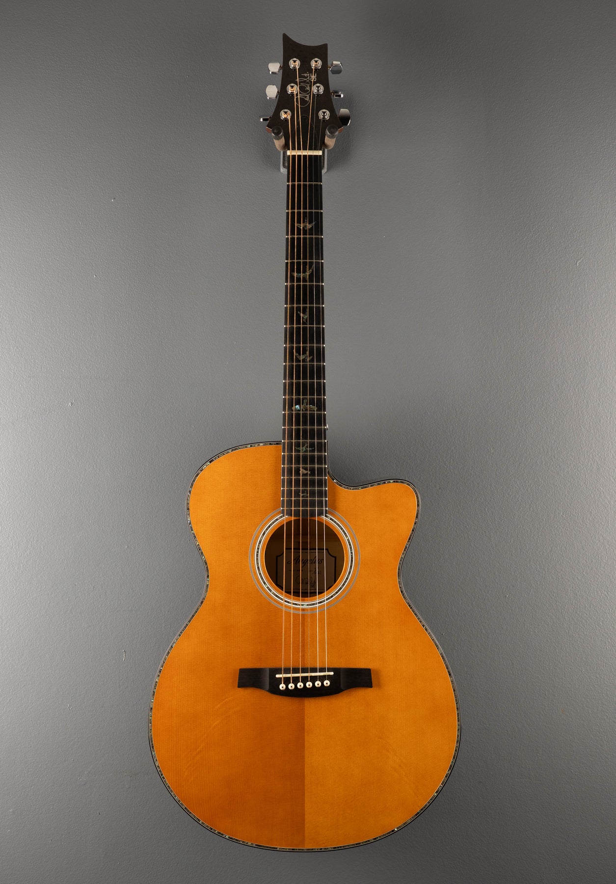 Excellent Condition, Natural w/Charcoal Burst, Angelus cutaway body shape, Solid Sitka Spruce top, PRS Hybrid “X”/Classical bracing pattern, Abalone with Black/White Rosette, Flame Maple back and sides, Black/White binding with the Abalone top purfling, Wide/Fat shaped Mahogany neck with a 11.81″ radius Ebony fingerboard and the Bird inlays, 25.3″ scale length, 1 11/16th” wide bone nut, PRS cast/sealed tuners, With the factory Fishman GT1 pickup system and hardshell case.