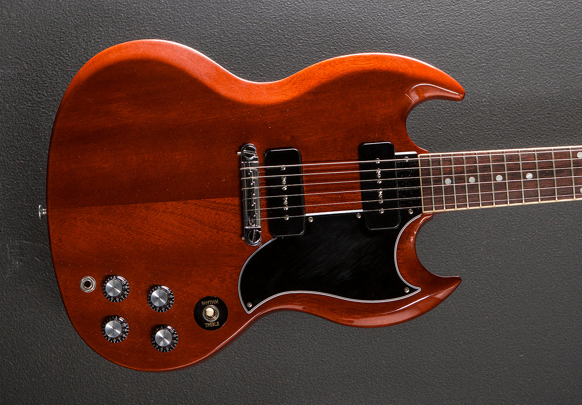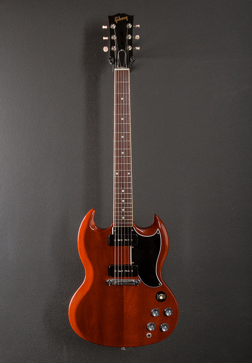 Vintage Cherry, Gloss nitrocellulose lacquer finish, Mahogany body, Slim taper shaped Mahogany neck, Bound 12” radius Indian Rosewood fingerboard with the acrylic dot inlays and medium jumbo frets, 24.75″ scale length, 1 11/16th″ nut width, Gibson P-90 bridge and neck pickups, 3-way toggle switching with the volume and tone controls for each pickup, Compensated wraparound bridge, Gibson vintage deluxe tuners, The neck thickness is .78″ at the first and .91″ at the 12th frets, 6.2 pounds, With the Gibson hardshell case, Very good