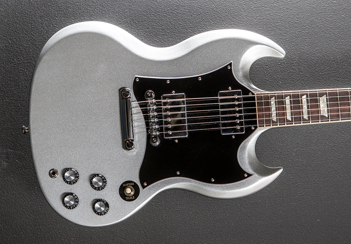 Silver Mist, Gloss nitrocellulose lacquer finish, Mahogany body, Rounded shaped Mahogany neck, Bound 12” radius Indian Rosewood fingerboard with the acrylic trapezoid inlays and medium jumbo frets, 24.75″ scale length, 1 11/16th″ nut width, Gibson 490T bridge and 490R neck pickups, 3-way toggle switching with the volume and tone controls for each pickup, Aluminum Nashville tune-o-matic bridge and aluminum stop tailpiece, Grover Rotomatic tuners, The neck thickness is .81″ at the first and .97″ at the 12th frets, 6.8 pounds, With the Gibson softshell case, Very good