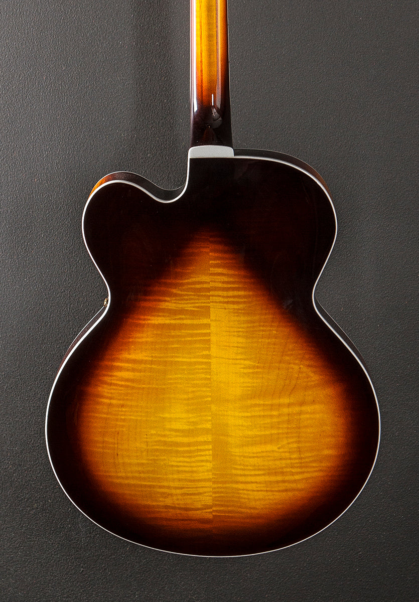 Original Sunburst, Gloss nitrocellulose lacquer finish, 17" wide hollow body, Sitka Spruce top, Curly Maple back and sides, White binding, Standard C shaped five piece Curly Maple neck, Bound 12” radius Ebony fingerboard and medium jumbo frets, 25.5” scale length, 1 11/16th" nut width, Seymour Duncan Seth Lover bridge and neck pickups, 3-way toggle switching with the volume and tone controls for each pickup, Adjustable Rosewood bridge and Finger Bail tailpiece, Grover Super Rotomatic tuners, The neck thickness is .83″ at the first and .95″ at the 9th frets, 7.2 pounds, With the Heritage hardshell case, Excellent