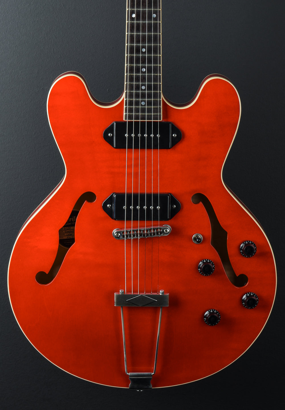 Translucent Cherry, Gloss nitrocellulose lacquer finish, Hollow body, Laminated Curly Maple top and back with the solid Curly Maple rim, Cream binding, Standard shaped Mahogany neck, Bound 12” radius Rosewood fingerboard with the Pearl Dot inlays and medium jumbo frets, 24.75” scale length, 1 11/16th" nut width, Lollar Dogear P-90 bridge and neck pickups, 3-way toggle switching with the volume and tone controls for each pickup, Locking tune-o-matic bridge and trapeze tailpiece, Heritage cast/sealed tuners, 6.4 pounds, With hardshell case