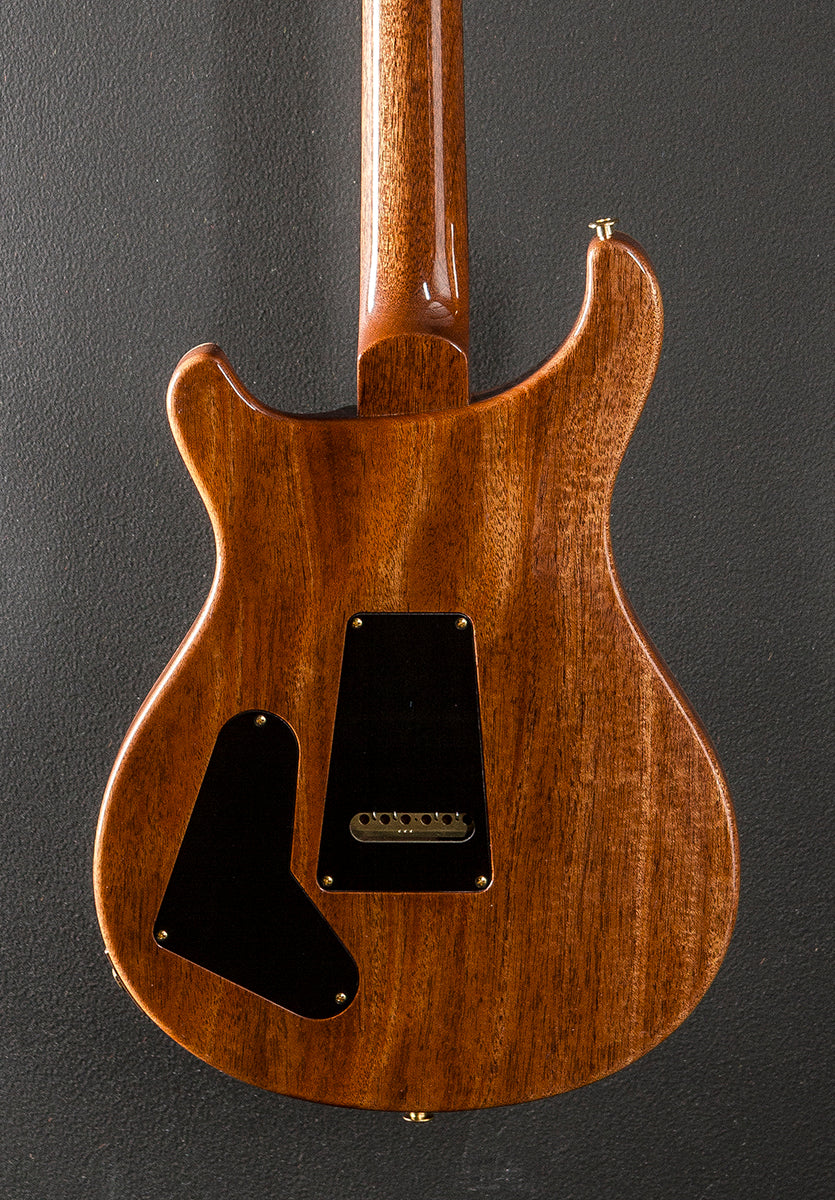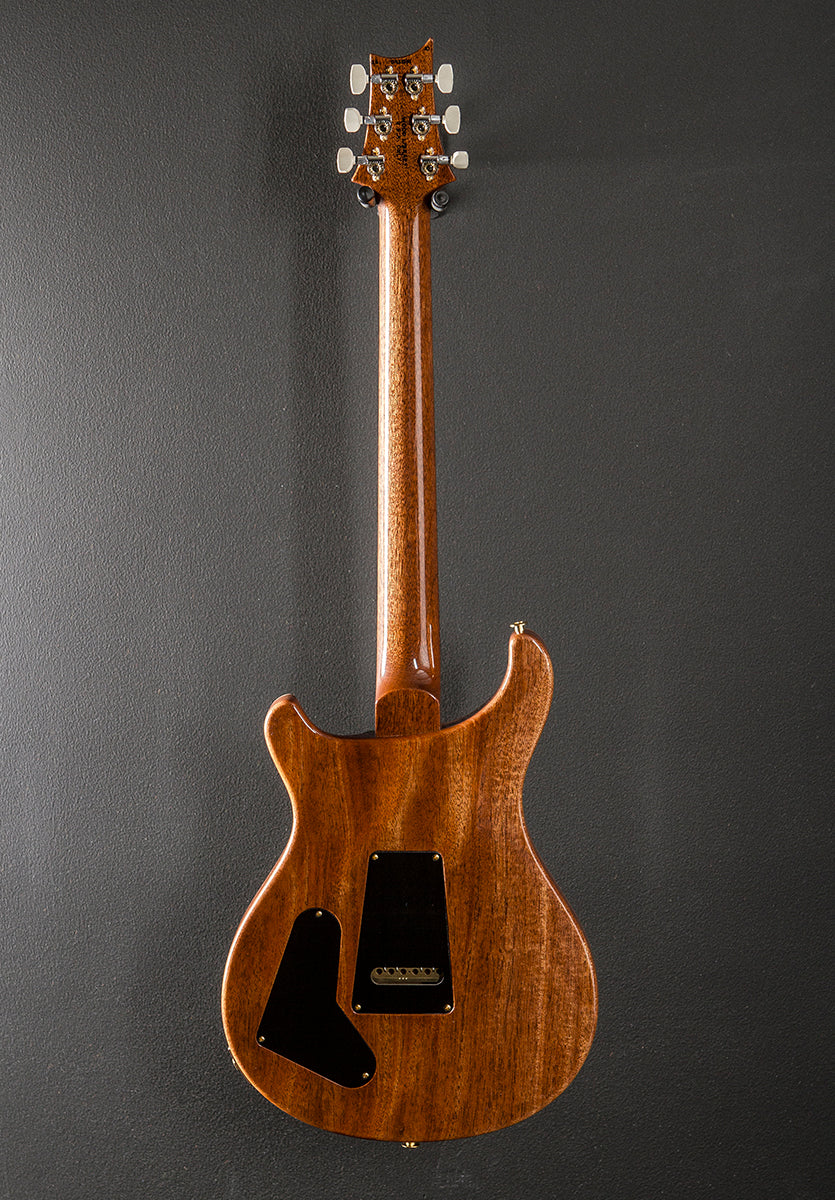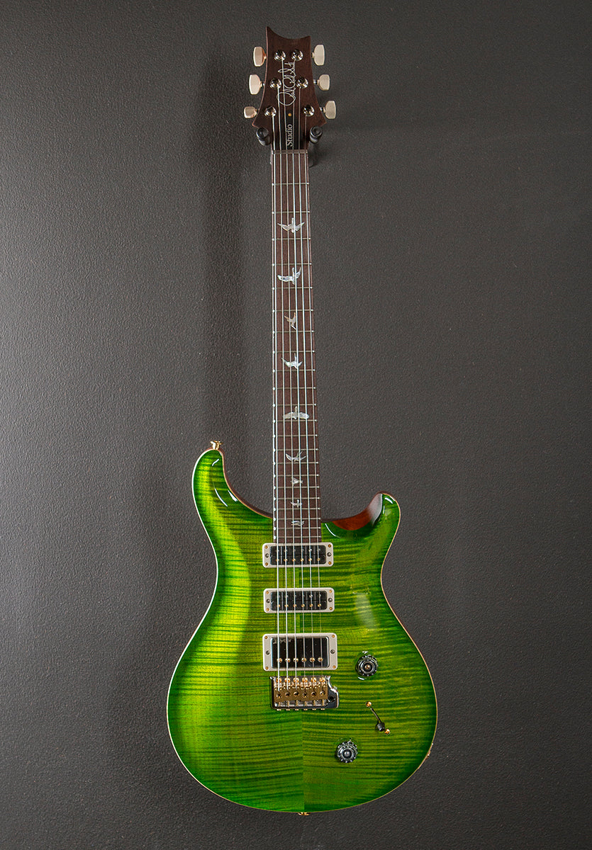 Eriza Verde, High gloss nitro finish, Violin carved Flame Maple 10 top, Mahogany body, Pattern carved Mahogany neck, 10" radius Brazilian Rosewood fingerboard with the Gold Mother of Pearl outlined Gold Mother of Pearl Bird inlays, Brazilian Rosewood headstock veneer, 25″ scale length, 1 11/16th" nut, PRS McCarty III bridge and PRS Narrowfield middle/neck pickups, 5-way blade switching with the volume and push/pull coil tap tone controls, PRS Gen III tremolo, PRS Phase III locking tuners with the wing buttons, 7.8 pounds, With the black paisley hardshell case