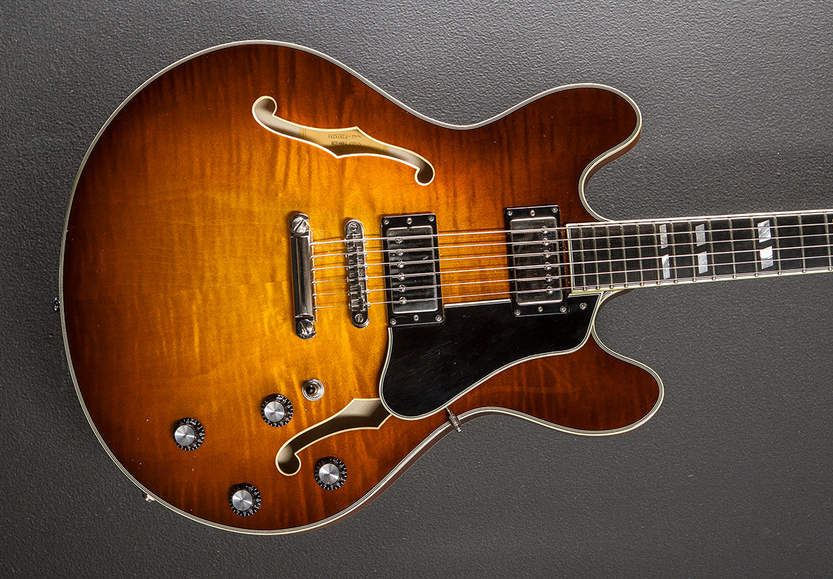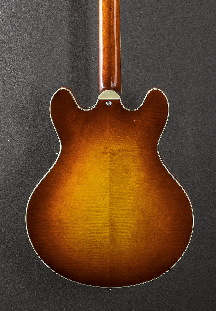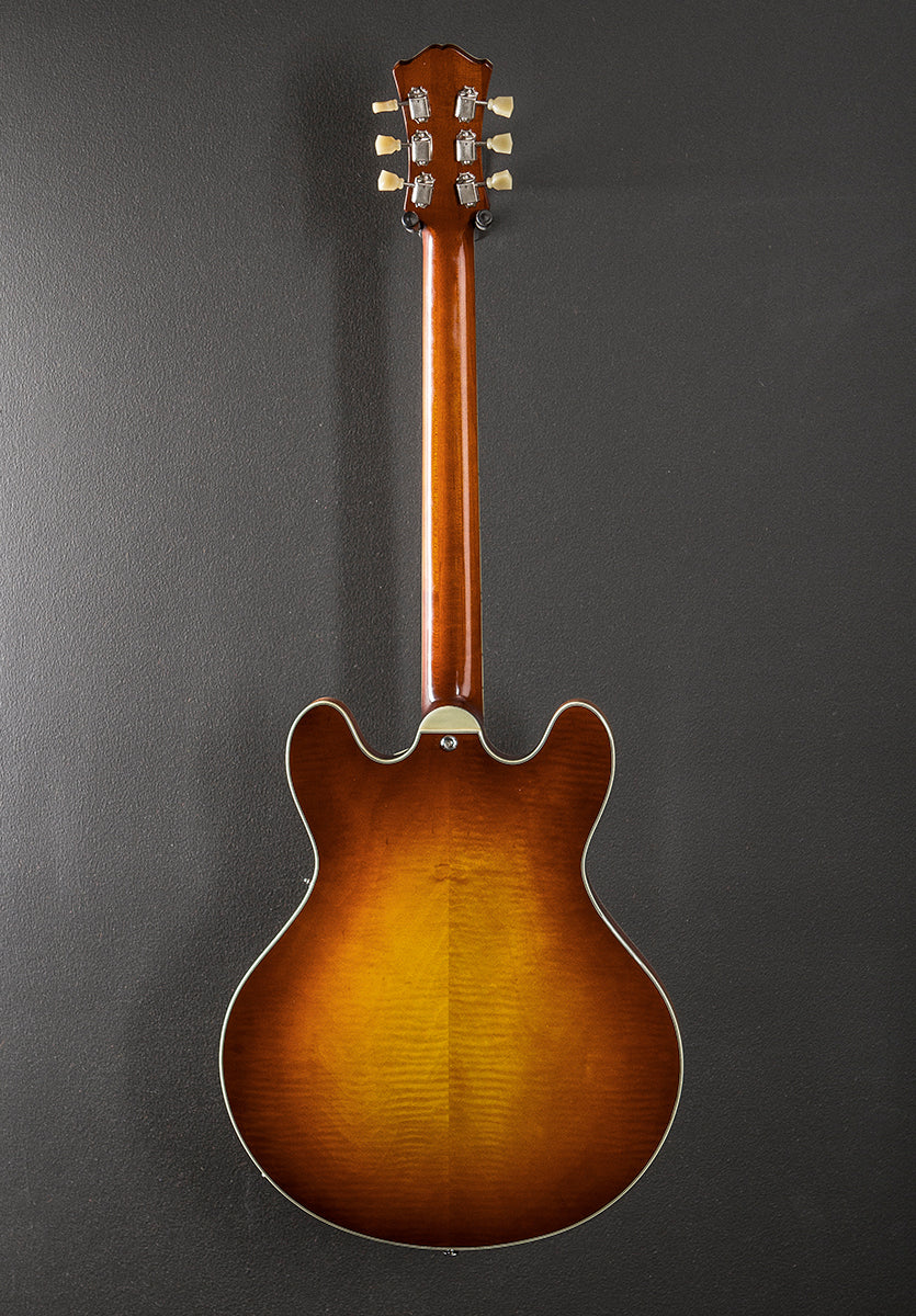 Gold Burst, Gloss finish, Semi-hollow laminated Flame Maple body with the centerblock, Multi-ply Ivoroid/Black binding, Bound 12” radius Ebony fingerboard with the pearl split block parallelogram inlays on a traditional even C shaped Maple neck, 24.75” scale length, 1 3/4” nut width, Seymour Duncan '59 bridge and Seymour Duncan Jazz neck pickups, 3-way toggle switching with the volume and tone controls for each pickup, Gotoh tune-o-matic bridge and stop tailpiece, Gotoh SD90 tuners, The neck thickness is .88″ at the first and .96″ at the 12th frets, 7.8 pounds, With the Eastman hardshell case, Very good