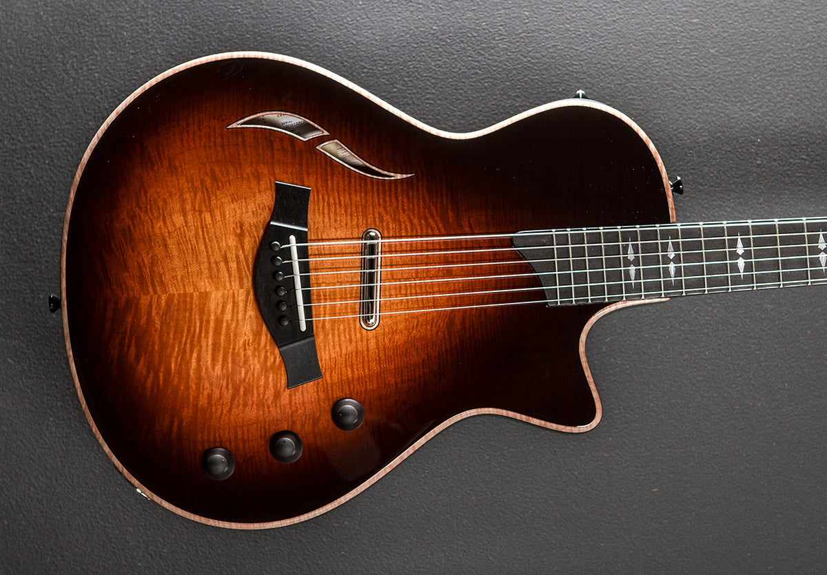 Tobacco Sunburst, Gloss finish, T5z body shape with the contoured armrest, Hybrid hollowbody design with the T5z bracing, Figured Big Leaf Maple top with the chamfered edge, Shamel Ash body, T5 electronics with the 5-way switching, Slim shaped neo-tropical Mahogany neck, 12" radius West African Crelicam Ebony fingerboard with the faux pearl silver Spire inlays and jumbo frets, 24 7/8th" scale length, 1 11/16th" nut width, Cast/sealed tuners, The neck thickness is .79″ at the first and .86″ at the 12th frets, 6.0 pounds, With the Taylor hardshell case, Excellent