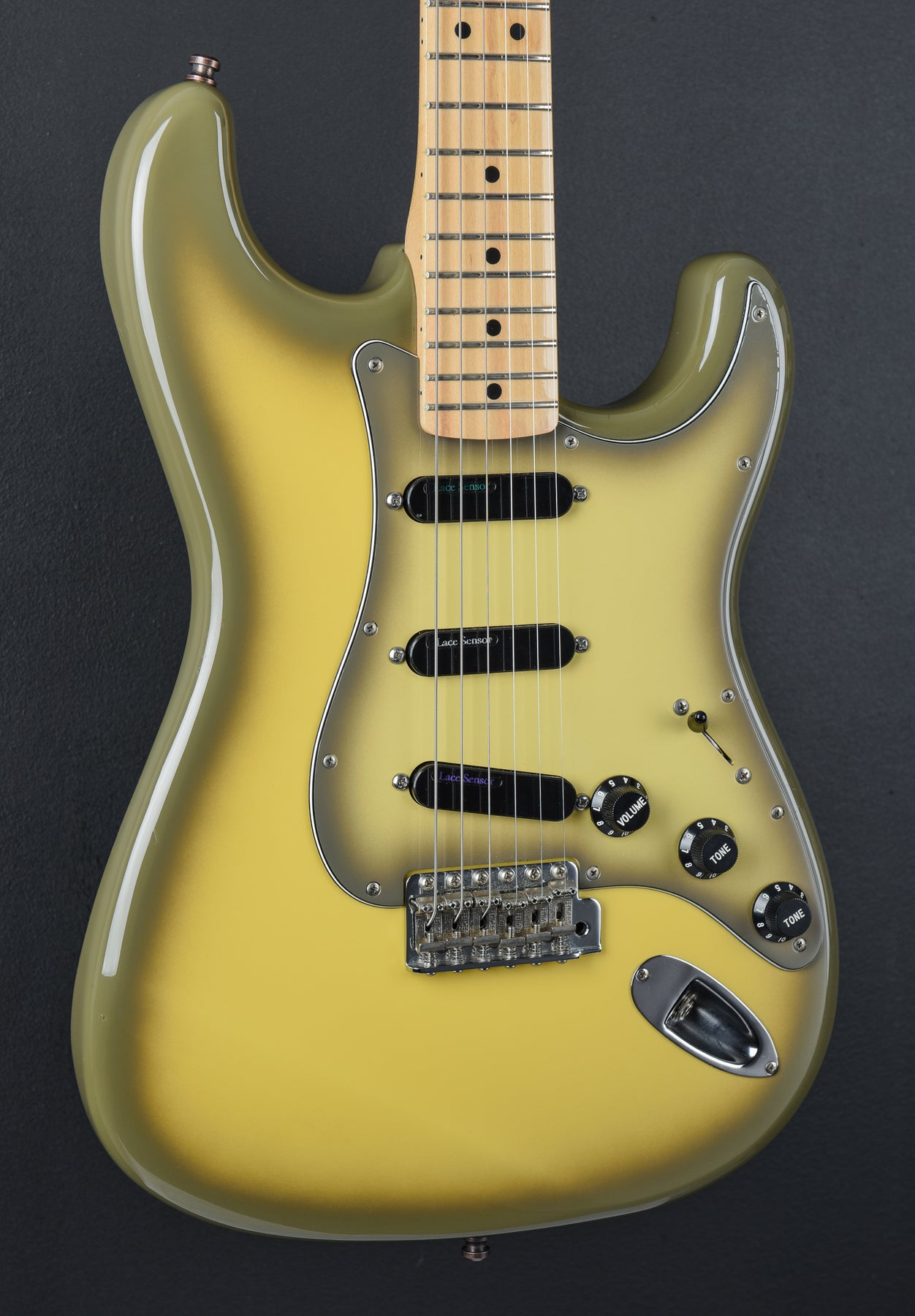 Very Good Condition, Antigua Finish, Crafted in Japan, Urethane Body Finish, Basswood Body, C Shaped Maple Neck with a 7.25" Radius Maple Fingerboard and Vintage Size Frets, 25.5" Scale Length, 1 5/8th" Nut Width, Lace Sensor Triple Rainbow Pickups, Reverse-Wound 5-Way Switching with Master Volume and Tone Controls for Neck and Middle Pickups, Vintage Style Synchronized Tremolo with Bent Saddles, Vintage Style Tuners, Neck Thickness of .82″ at the 1st Fret and .93″ at the 12th Fret, 7.5 pounds, Comes with the Original Hardshell Case.