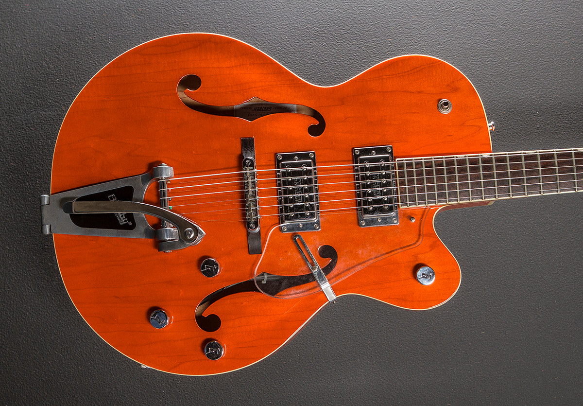 Orange Stain, Gloss finish, Hollow laminated Maple body with the soundpost bracing, U shaped Maple neck with a bound 12" radius Rosewood fingerboard and medium frets, 24.6" scale length, 1 11/16th" nut width, Gretsch Black Top Filter'Tron humbucking bridge and neck pickups, 3-way toggle switching with the master volume and tone controls plus a volume control for each pickup, Tune-o-matic bridge with a Rosewood base, Bigsby B60 vibrato and vintage style open gear tuners, The neck thickness is .83″ at the first and .93″ at the 9th frets, 6.8 pounds, With a newer SKB molded plastic hardshell case, Very good