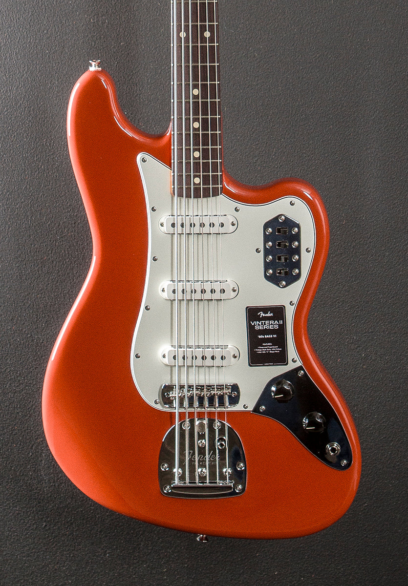 Fiesta Red, Made in Mexico, Alder body, Gloss polyester body finish, Mid 60's C shaped Maple neck with a 7.25” radius slab Rosewood fingerboard and vintage tall frets, 30" scale length, 1.650" nut width, Vintage style Bass VI single coil pickups, Master volume and tone controls plus the three pickup on/off switches and one low cut switch, Vintage style adjustable bridge and floating tremolo with the lock button, Vintage style tuners, 9.4 pounds, With gig bag