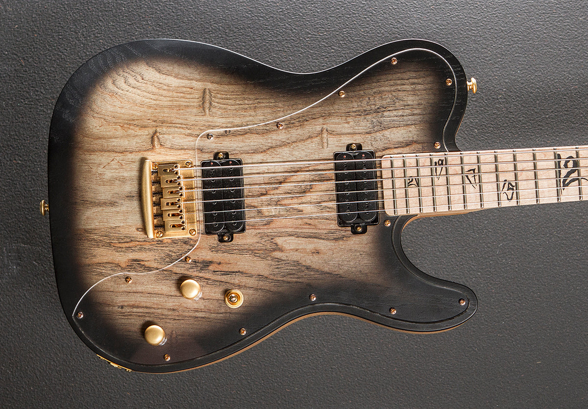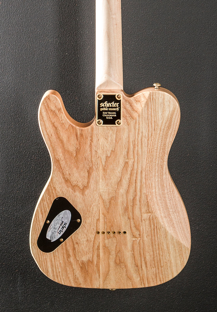 Charcoal Burst, Satin finish, Ash body with the rear contour, Thin C shaped Maple neck with the carbon fiber reinforcement rods, 14" radius Maple fingerboard with the black number inlays and extra jumbo frets, 27.5" scale length, 1 11/16th" nut width, Schecter USA Brimstone bridge and neck pickups, 3-way toggle switching with the master volume and push/pull coil tap tone controls, Diamond hardtail string thru body bridge with the block steel saddles, Schecter locking tuners, The neck thickness is .76″ at the first and .86″ at the 12th frets, 7.6 pounds, No case, Very good