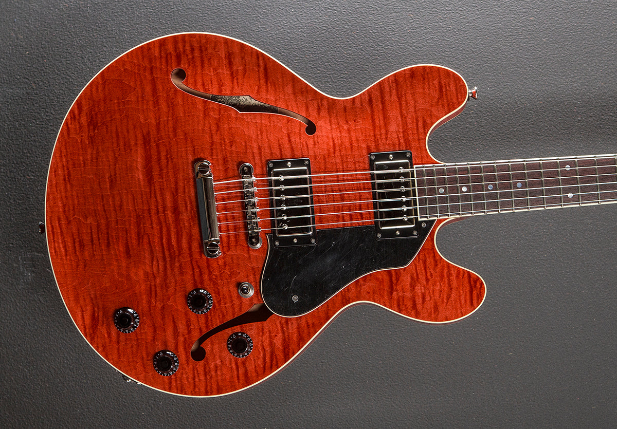 "The I-35 LC features a maple laminate top, sides, and back, the result of a custom-laminated construction process that Bill Collings and his R&D team developed in pursuit of the best tonal qualities of semi-hollow guitar design. Crafted to respond acoustically in perfect harmony with its electronics, the design and technique used for our “LC” models has provided another unique way for us to voice our instruments for superior response and tone."