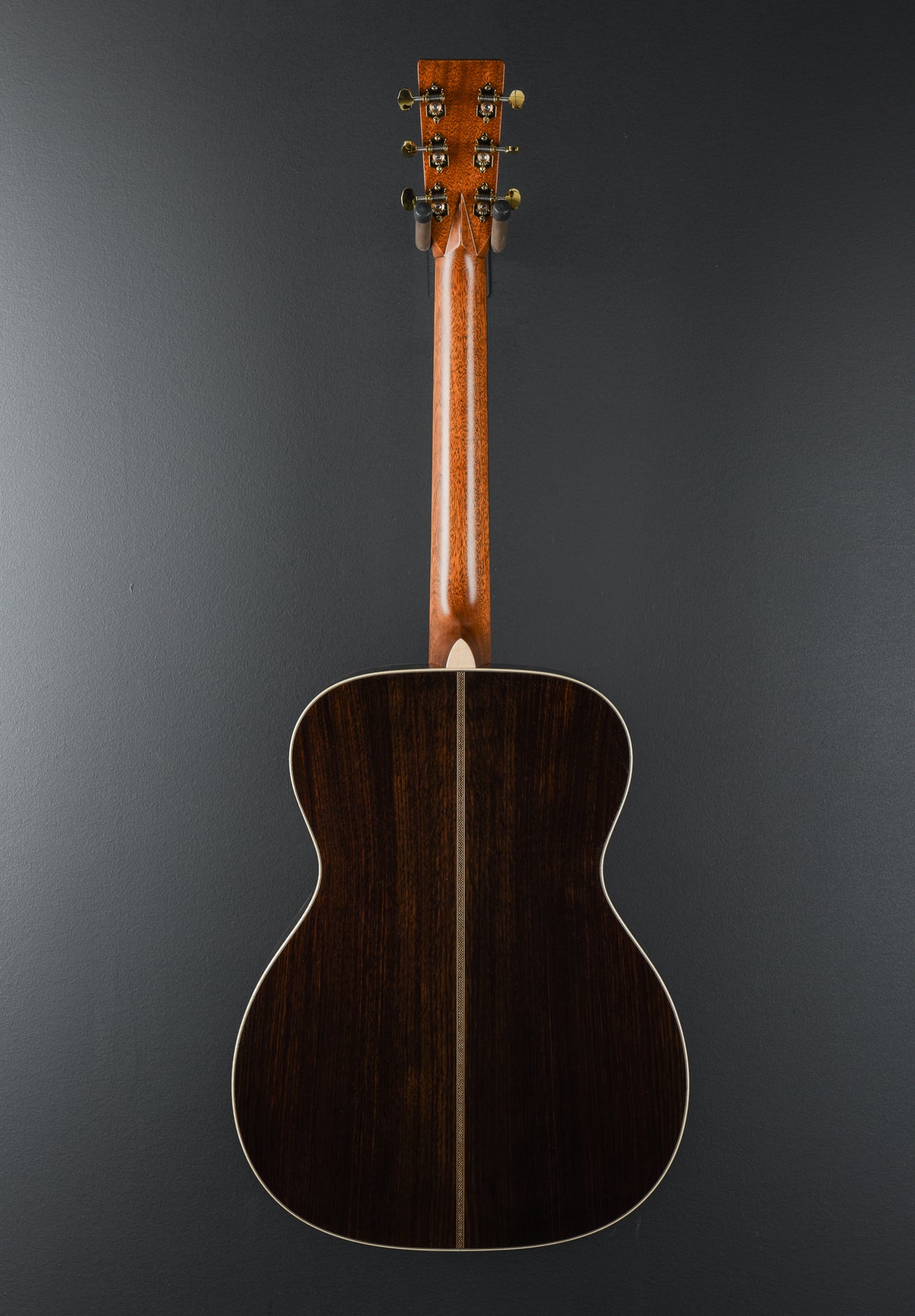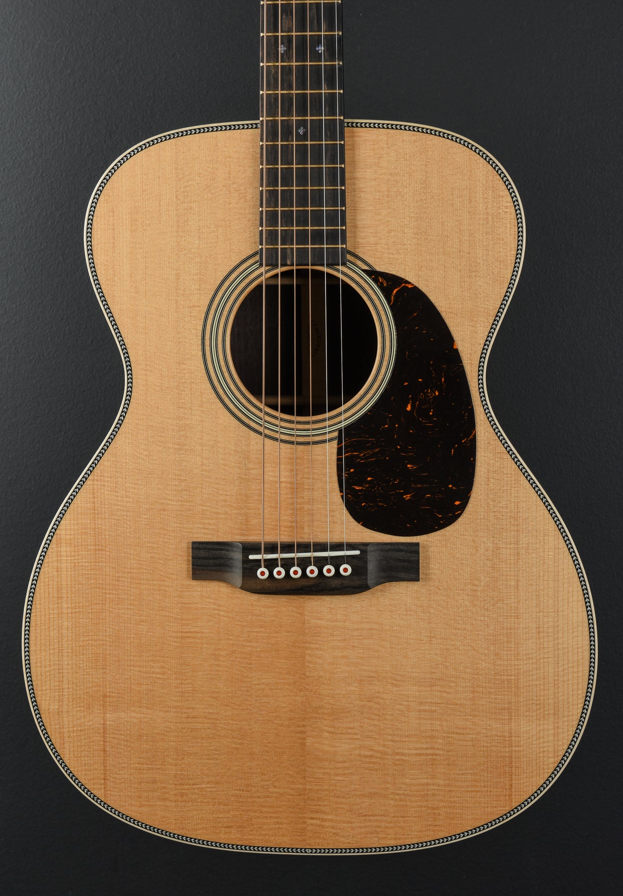 Natural, 000-14 Fret body shape, Solid Sitka Spruce top w/VTS, Adirondack Spruce scalloped X bracing w/VTS, Style 28 multi-stripe Rosette, European Flame Maple binding with the Bold Herringbone top and multi-stripe back inlay, East Indian Rosewood back and sides, Zig-Zag Authentic back purfling, Ebony fingerboard with the Abalone long pattern Diamond and Squares position markers on a vintage deluxe w/high performance taper shaped Mahogany neck, 24.9″ scale length, 1 3/4” nut width, Waverly tuners, With hardshell case